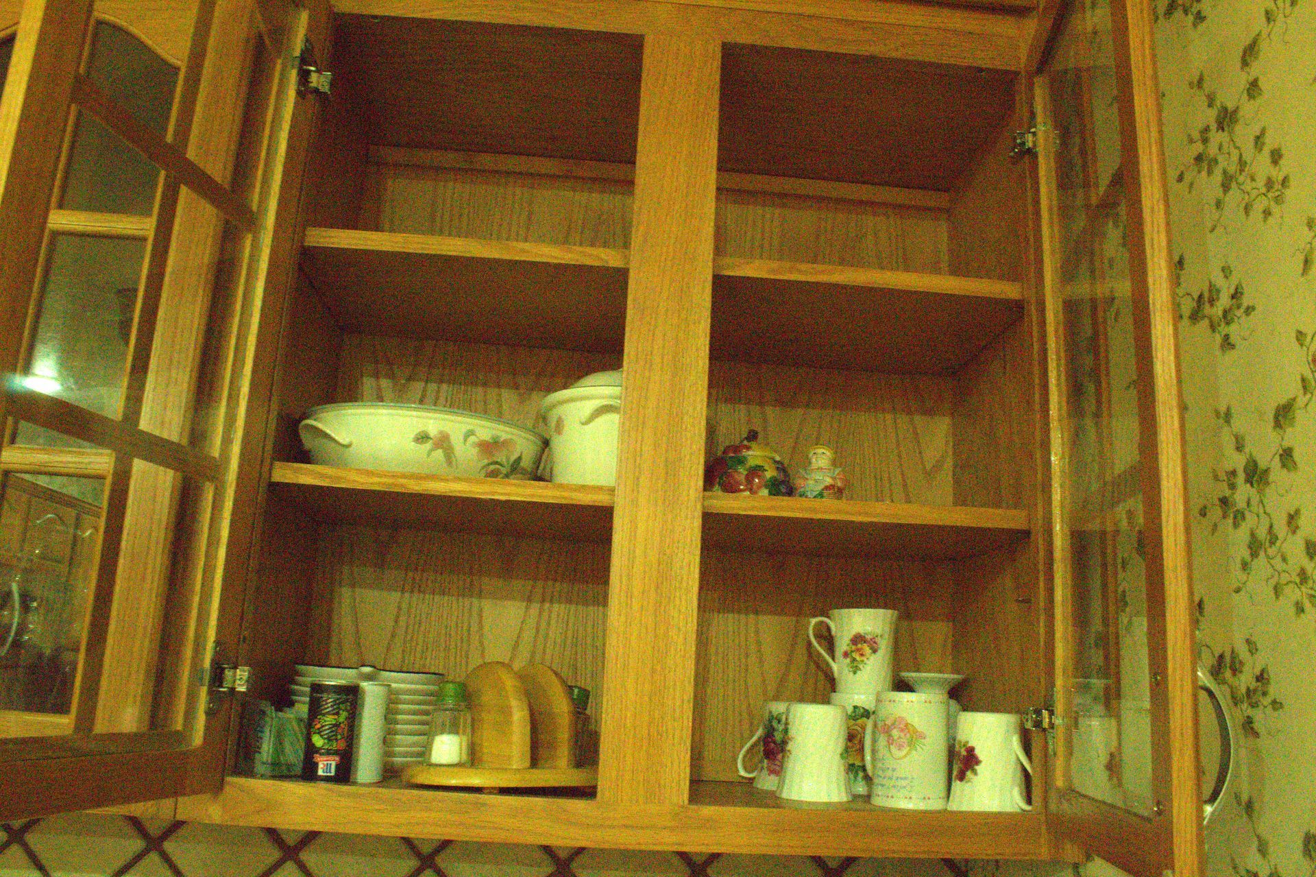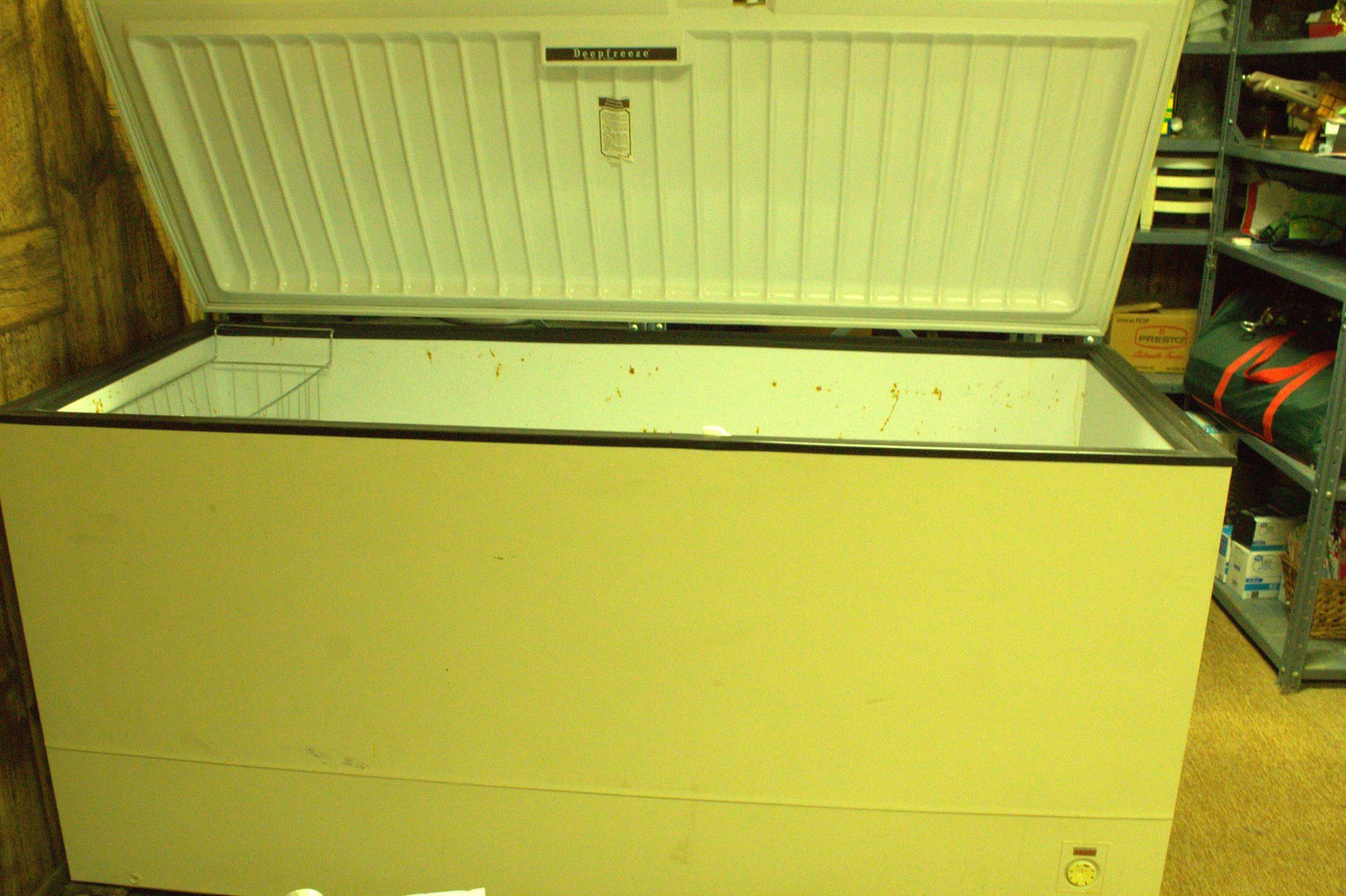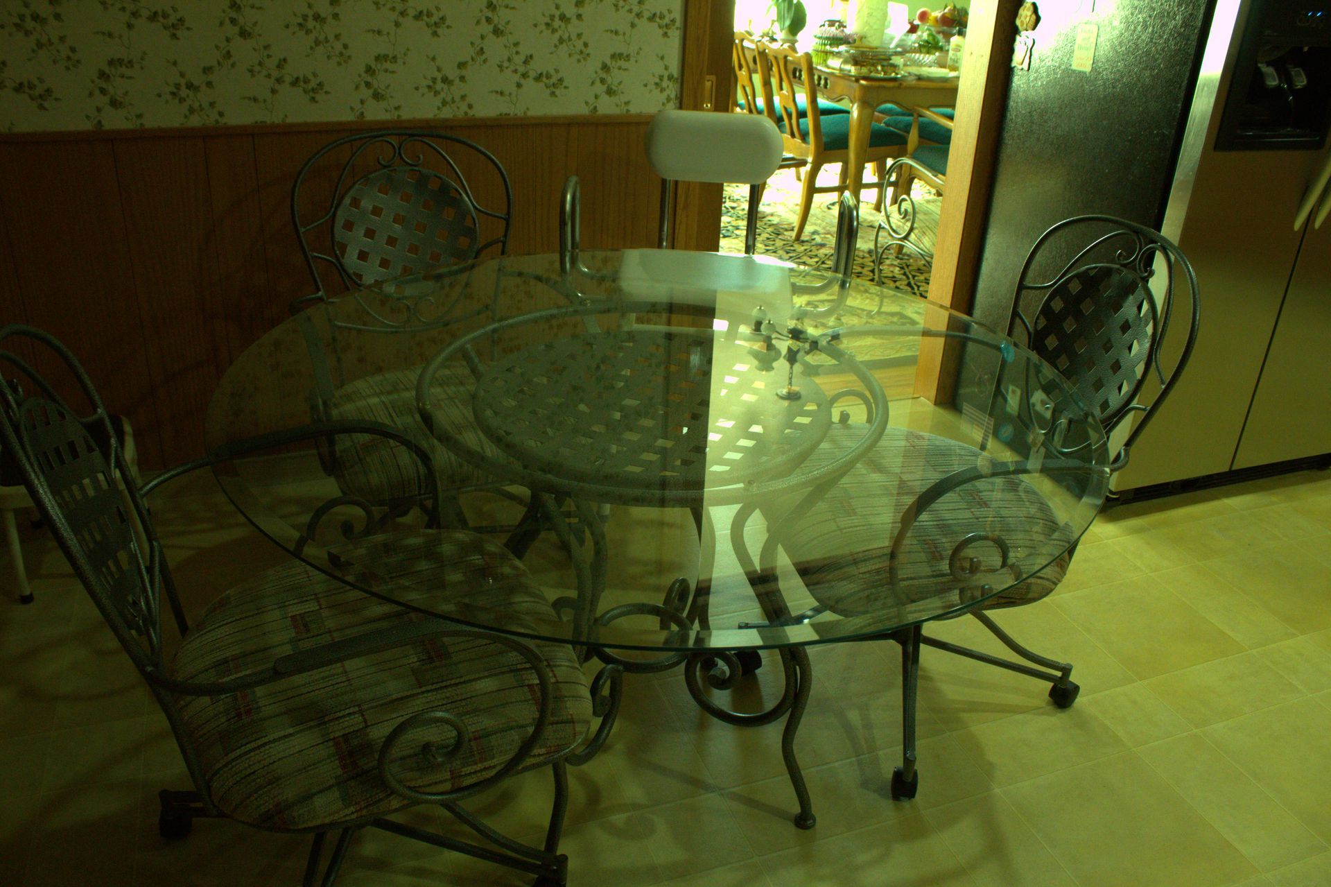 KITCHEN ITEMS: Glass top dining table with 6 chairs, dining room suite with table, 5 chairs and hutch, chest-type Amana deep freezer, Whirlpool double door refrigerator, Pyrex, Mikasa dishes, Sheffield Bone White dishes, snack trays, cookbooks, small electrical appliances, canister set, coffee makers, silverware, knives, baking items, cooking utensils, coffee mugs, salt and pepper shakers, champagne glasses/flutes, wine glasses, dishes.