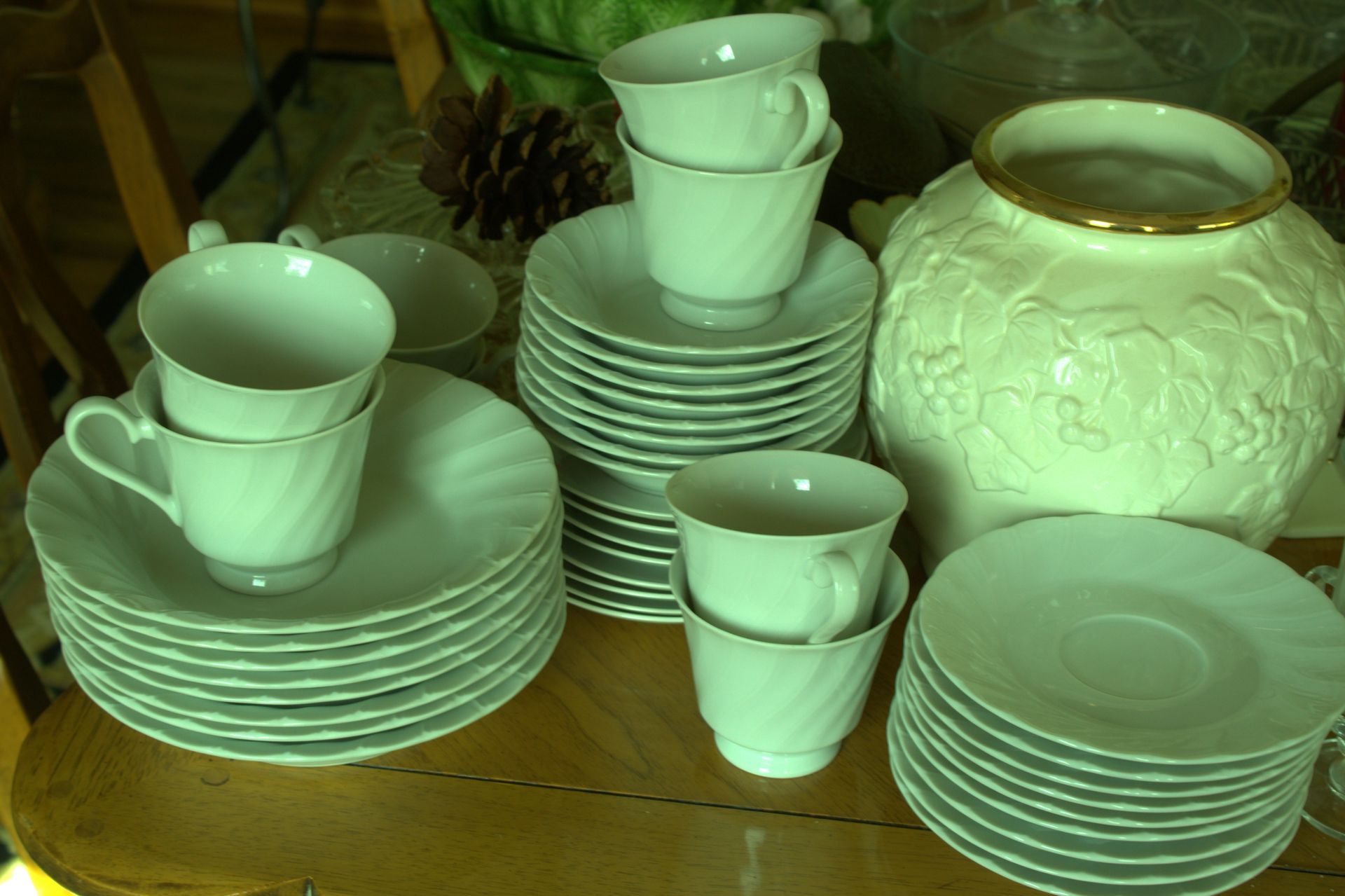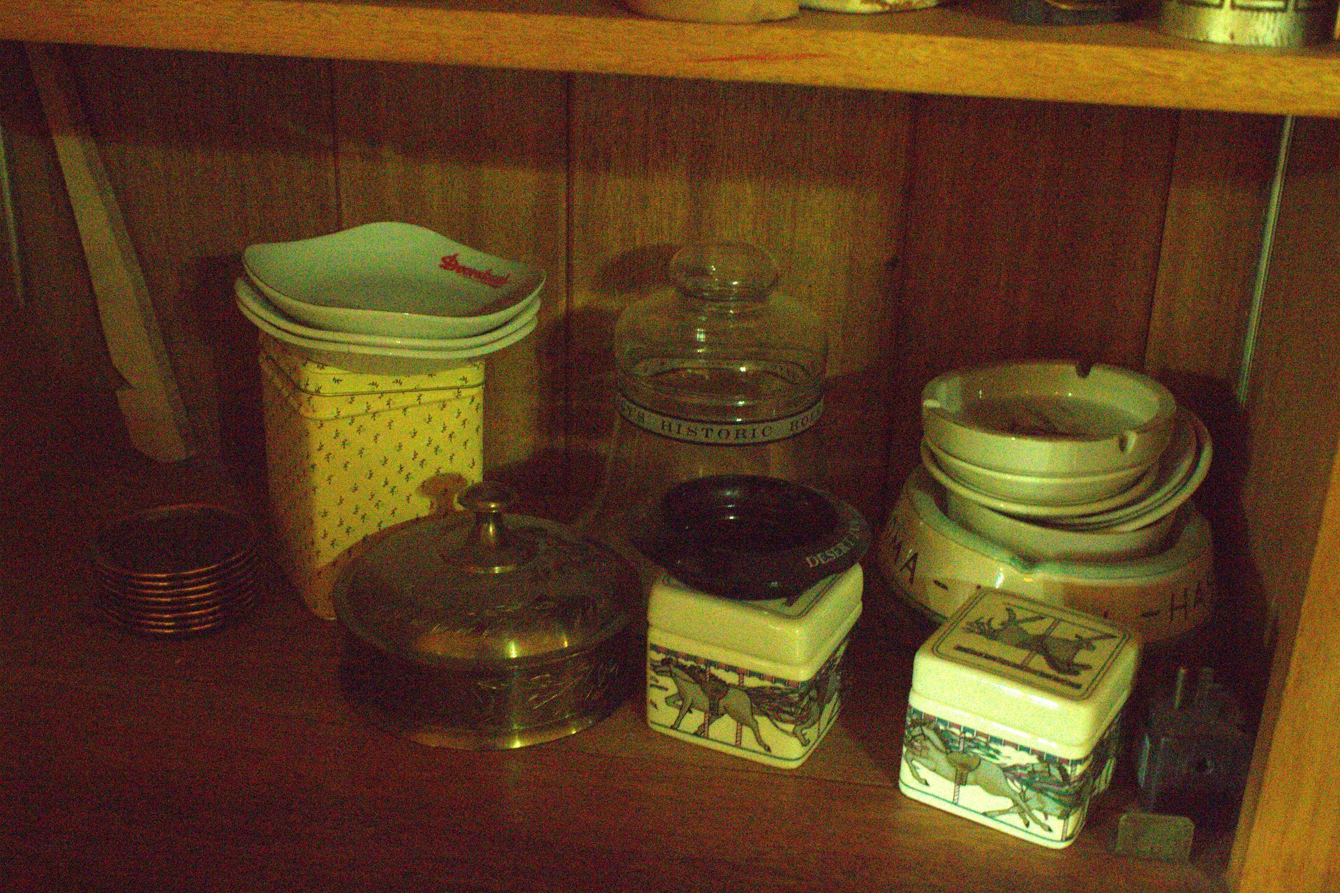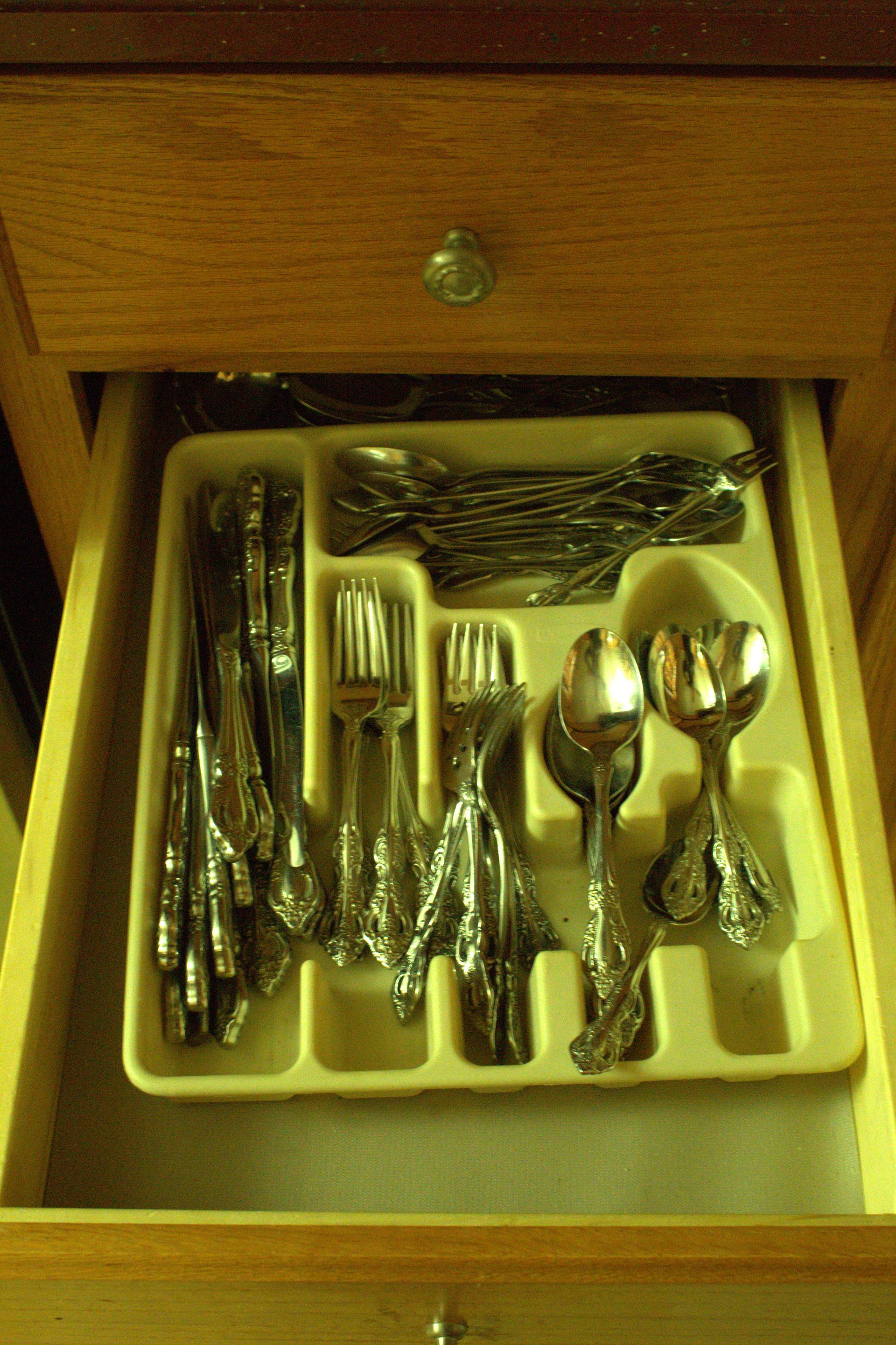 KITCHEN ITEMS: Glass top dining table with 6 chairs, dining room suite with table, 5 chairs and hutch, chest-type Amana deep freezer, Whirlpool double door refrigerator, Pyrex, Mikasa dishes, Sheffield Bone White dishes, snack trays, cookbooks, small electrical appliances, canister set, coffee makers, silverware, knives, baking items, cooking utensils, coffee mugs, salt and pepper shakers, champagne glasses/flutes, wine glasses, dishes.