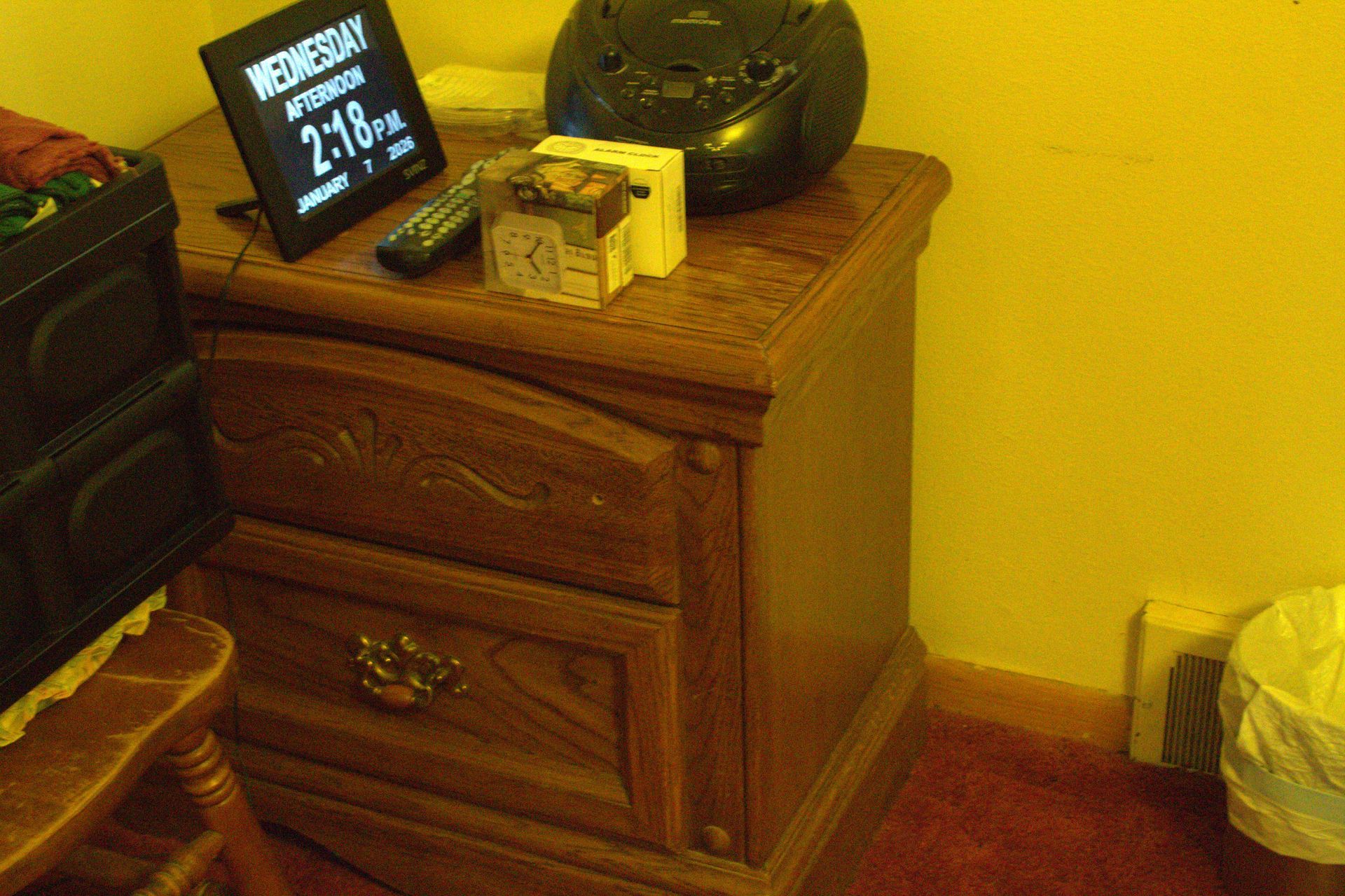 BEDROOM FURNITURE: Gold-plated glass top nightstands, 3-piece bedroom suite including queen bed, frame, dresser, mirror, and chest; 3-piece bedroom suite including king box spring, mattress, dresser, and nightstand.
