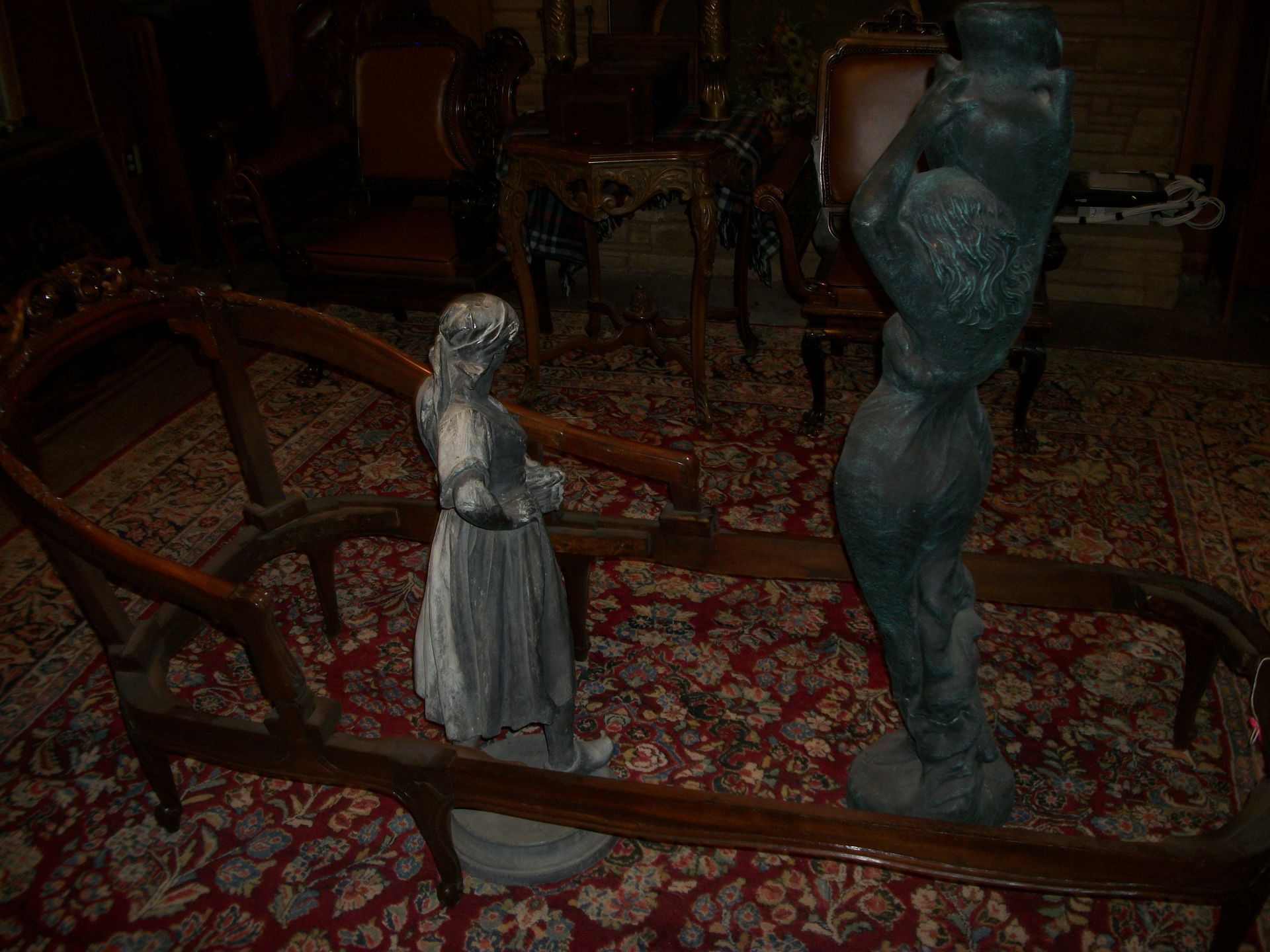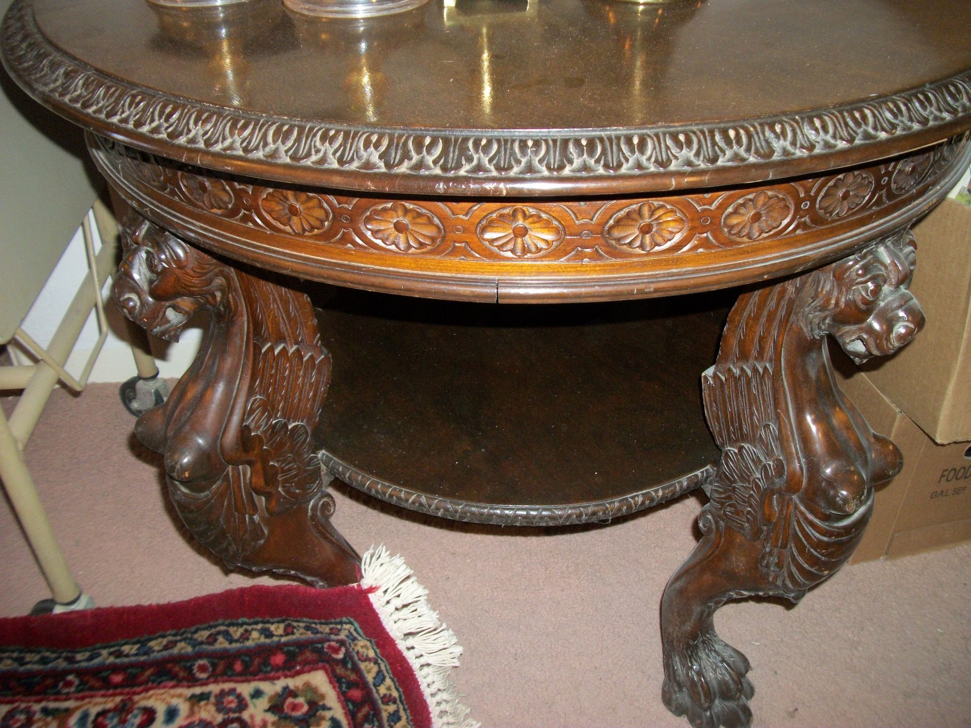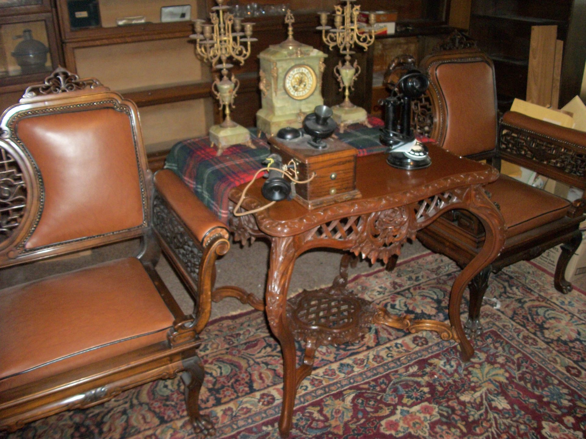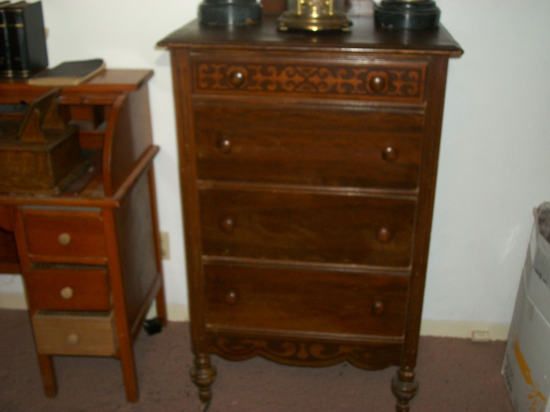 ANTIQUE FURNITURE: Handcrafted China cabinet, marble top chest, marble top end tables/storage, small China cabinet colina/style, wood lamp tables, antique cabinet, dragon leg/footed tables, leather/wood carved dragon claw footed chairs, solid wood 3 pc bedroom suite dresser, chest, bed, drop front desk, 3/4/5 drawer chest, marble top lingerie cabinet, full size hand carved bed, hand carved buffet, claw footed organ stool, marble top night stand, twin bed, coffee table, end table, tea cart, wood 4 drawer filing cabinet, oak library tables, porcelain cook stove, dining table/6 chairs, settee bench, 2/3/4/5/6 deep lawyer bookcases, smoke stand, rocker, fireplace screen