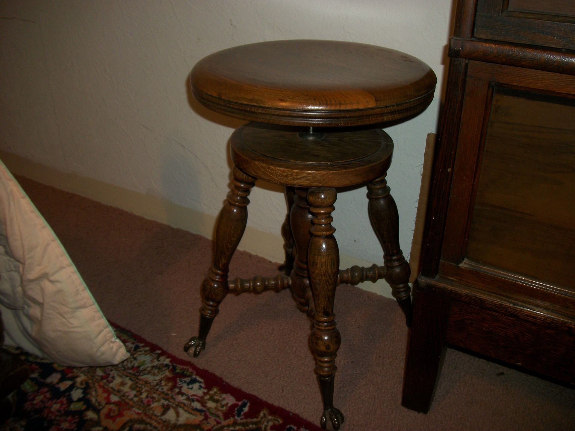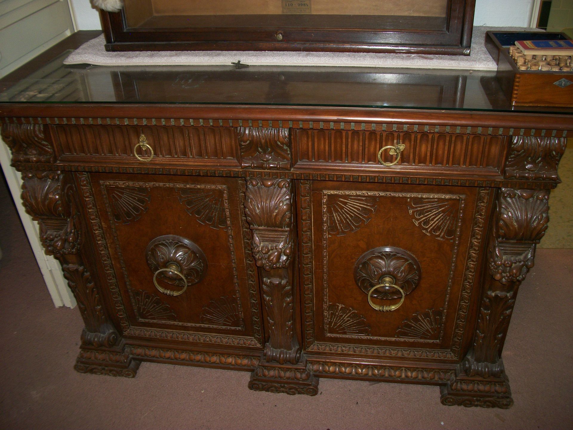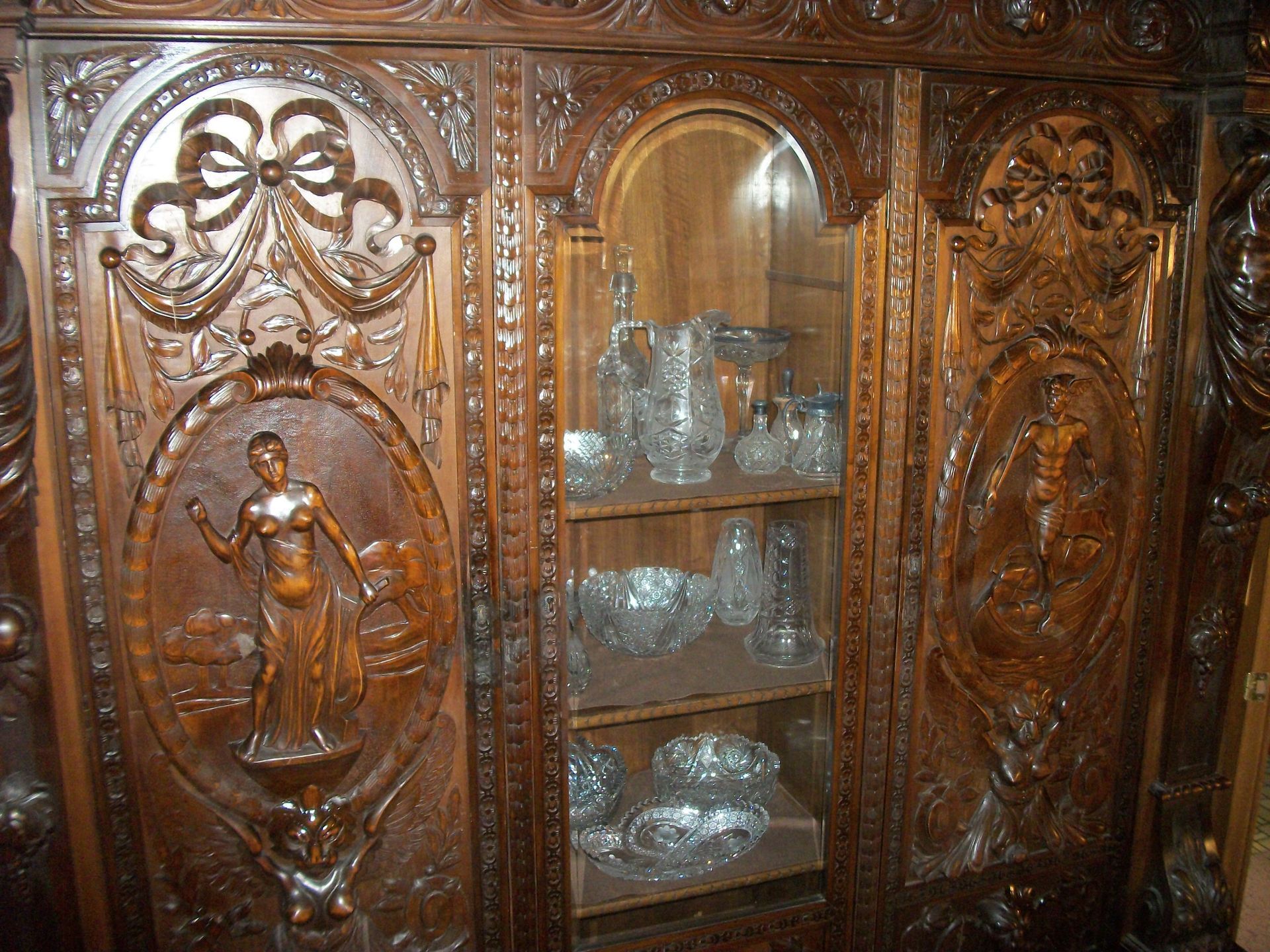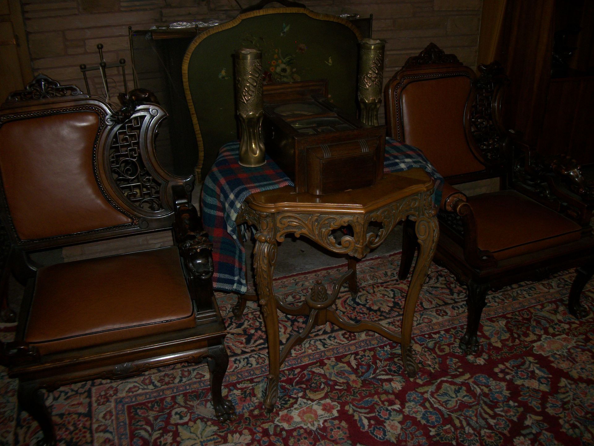 ANTIQUE FURNITURE: Handcrafted China cabinet, marble top chest, marble top end tables/storage, small China cabinet colina/style, wood lamp tables, antique cabinet, dragon leg/footed tables, leather/wood carved dragon claw footed chairs, solid wood 3 pc bedroom suite dresser, chest, bed, drop front desk, 3/4/5 drawer chest, marble top lingerie cabinet, full size hand carved bed, hand carved buffet, claw footed organ stool, marble top night stand, twin bed, coffee table, end table, tea cart, wood 4 drawer filing cabinet, oak library tables, porcelain cook stove, dining table/6 chairs, settee bench, 2/3/4/5/6 deep lawyer bookcases, smoke stand, rocker, fireplace screen