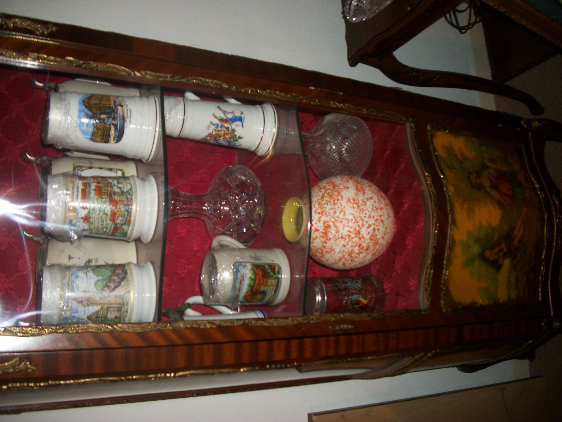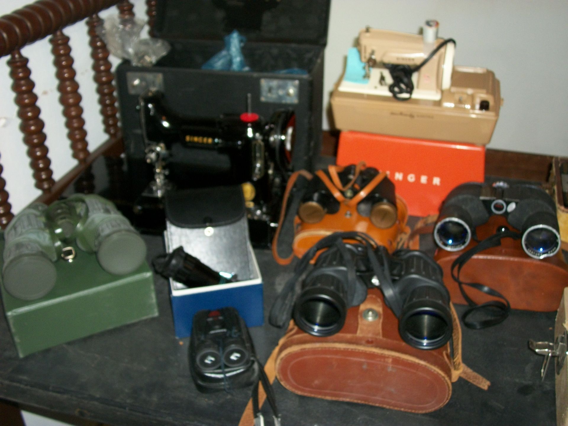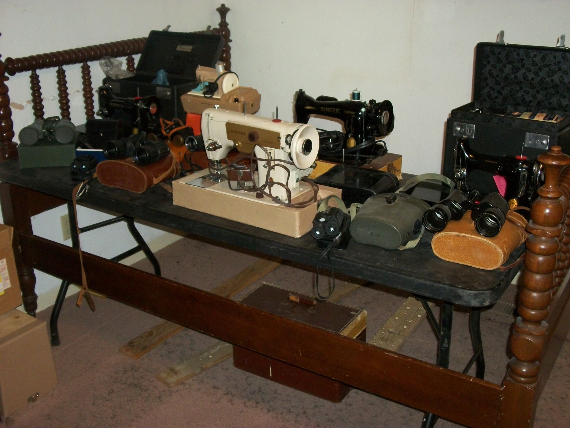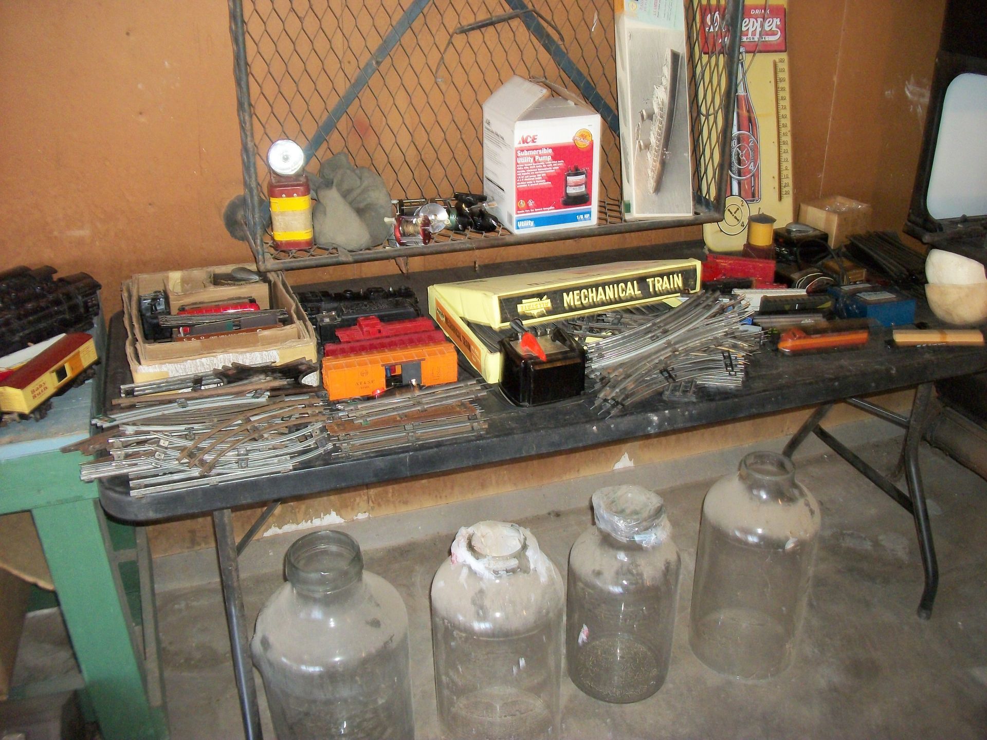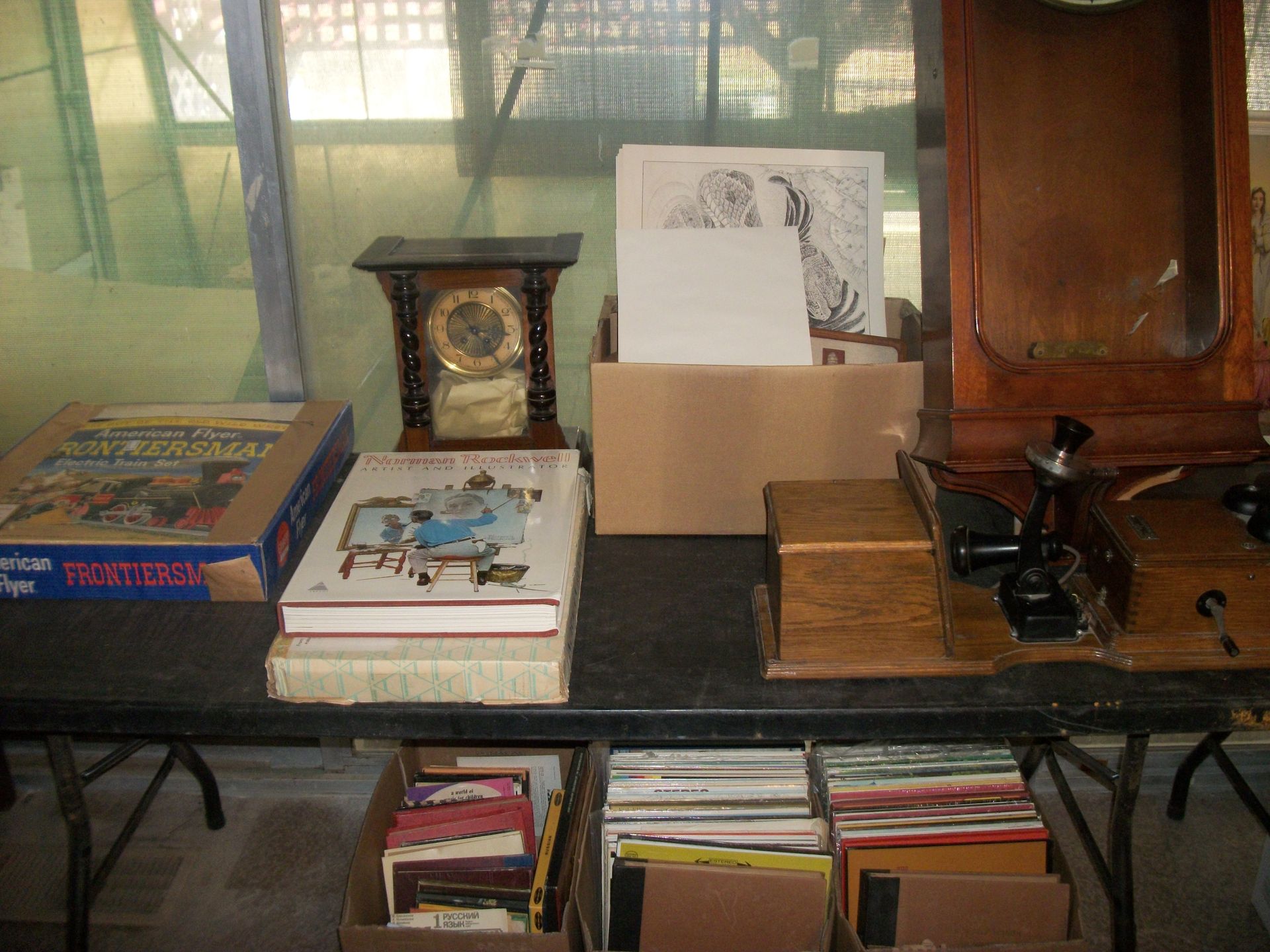 ANTIQUES AND MORE: 2 beautiful crystal lamps, figurine lamps, pitcher/bowl set, floor lamps, hand made floor rugs, Indian blankets, Indian pottery, pyrex, fire king, heavy pressed glass, crystal glass, Hummel pieces, pink depression, Peanuts lunch box/thermos, sterling lamp sets, R S Prussia dishes, Johnson bros set of dishes, biscuit jar, porcelain, statures, bust, cupid brass clock, mantel clocks, wall clocks, coo-coo clocks, green marble mantel clock, 2 candle abras, antique wall mount telephones, radial turn dial telephones, medical design brass statues, hand carved mirrors, shadow box mirrors, gum ball machine, American Flyer Frontiers-men train set in original box, 2 other train sets, American MFC Co. Character Reading scale, brass pieces, arrow heads, medical beakers, ostrich eggs, antique toys, opera glasses, binoculars, tapestry's, record player, camera/tripods, metal Dr pepper sign, Therma chest cooler, antique press, jewelry, treadle sewing machine base, feather weight singer sewing machines, kids singer sewing machine, marbles, religious items, medical instruments, lounger, child rocker, trunks, water round, water trough, air compressor, clay pots, milk parlor chairs, Bronze Coyote by Roger Aston