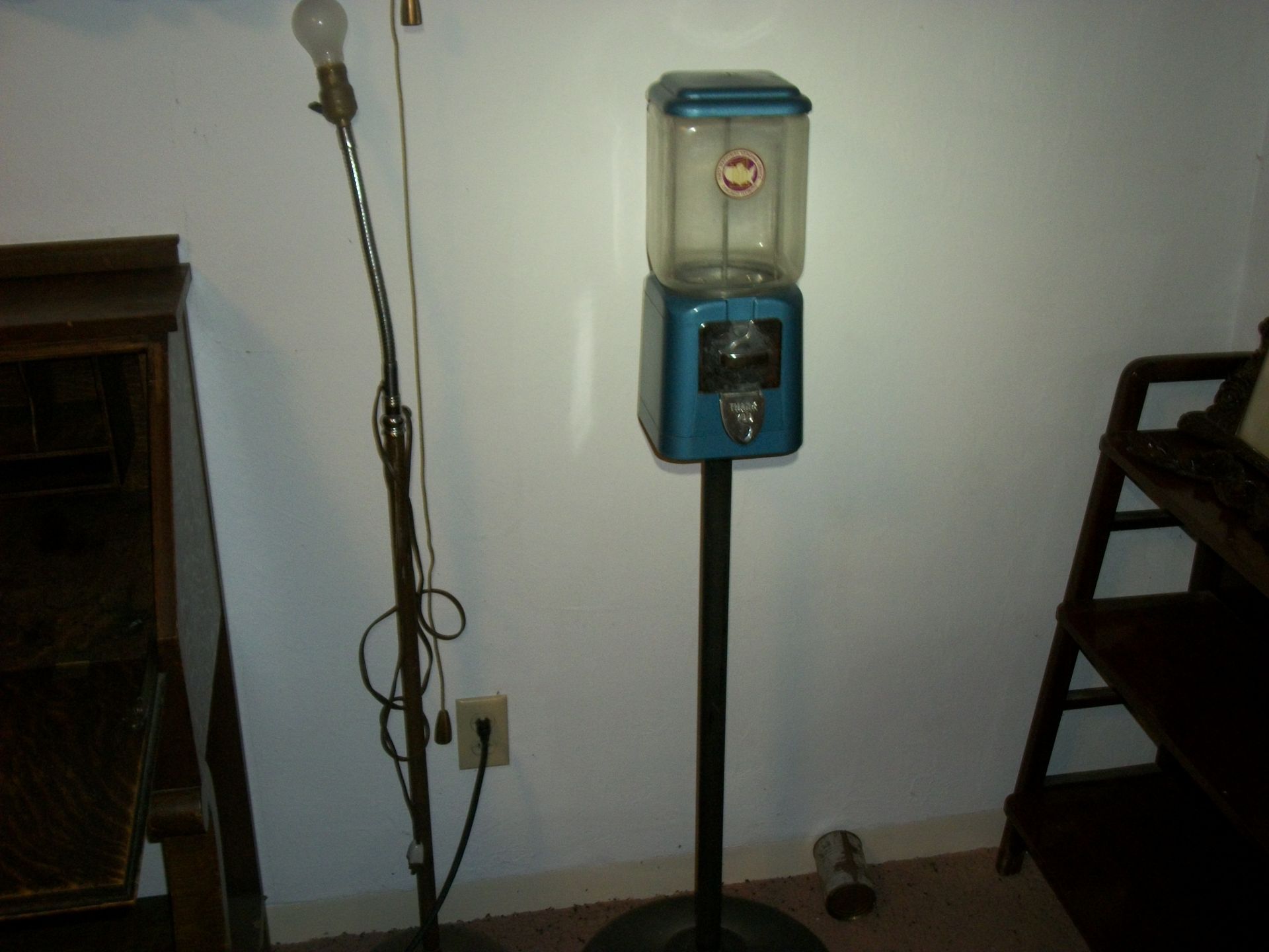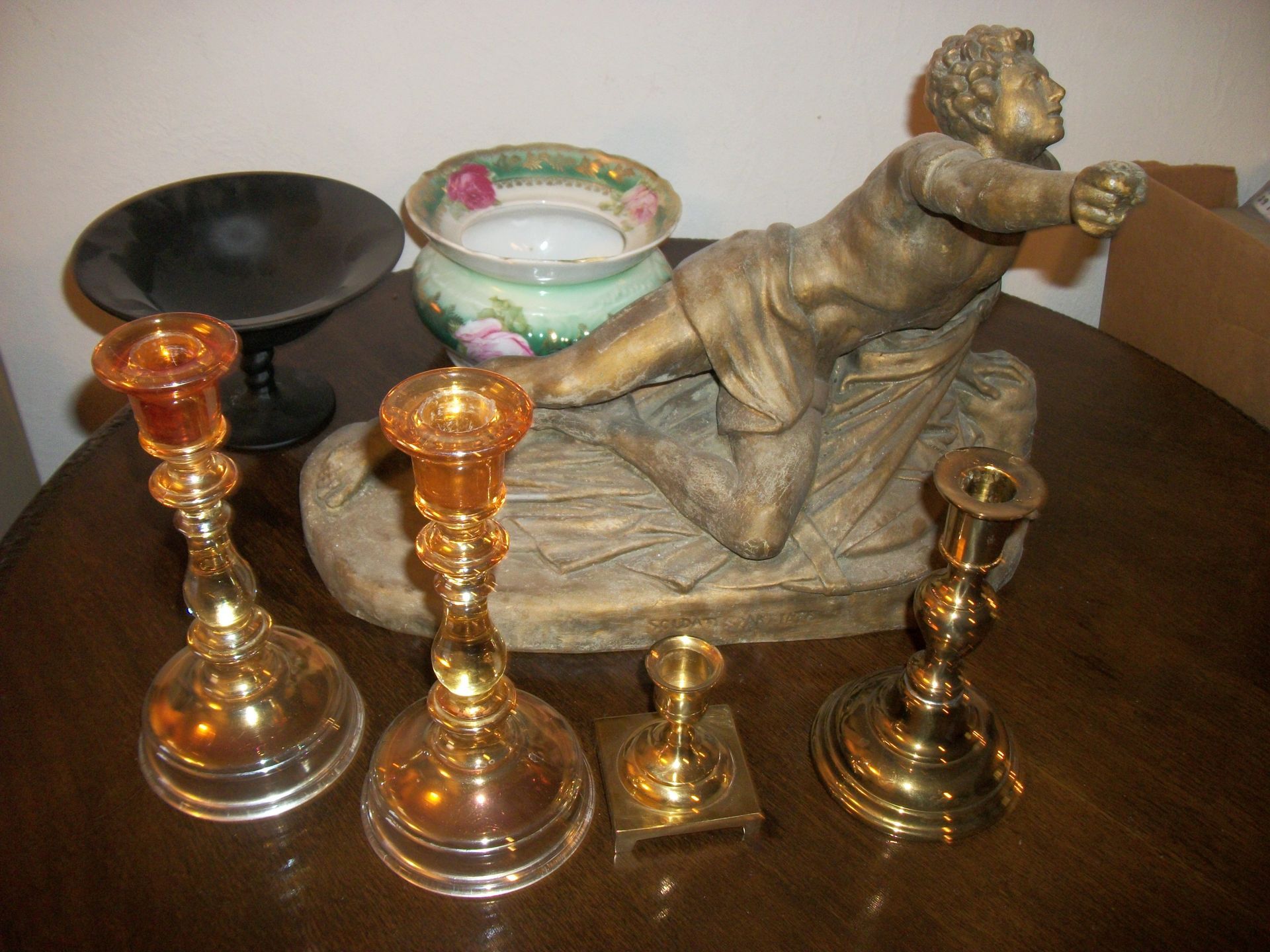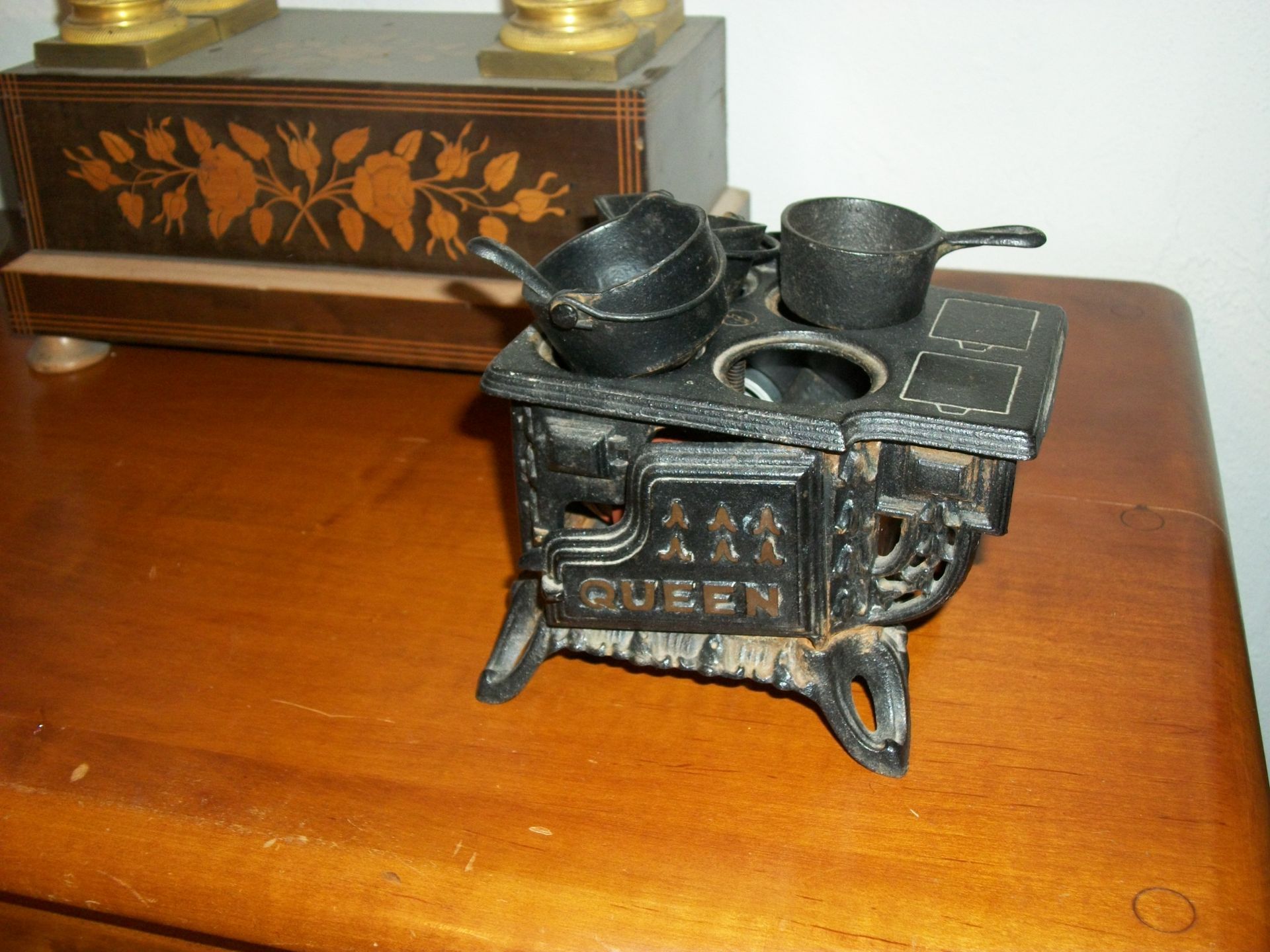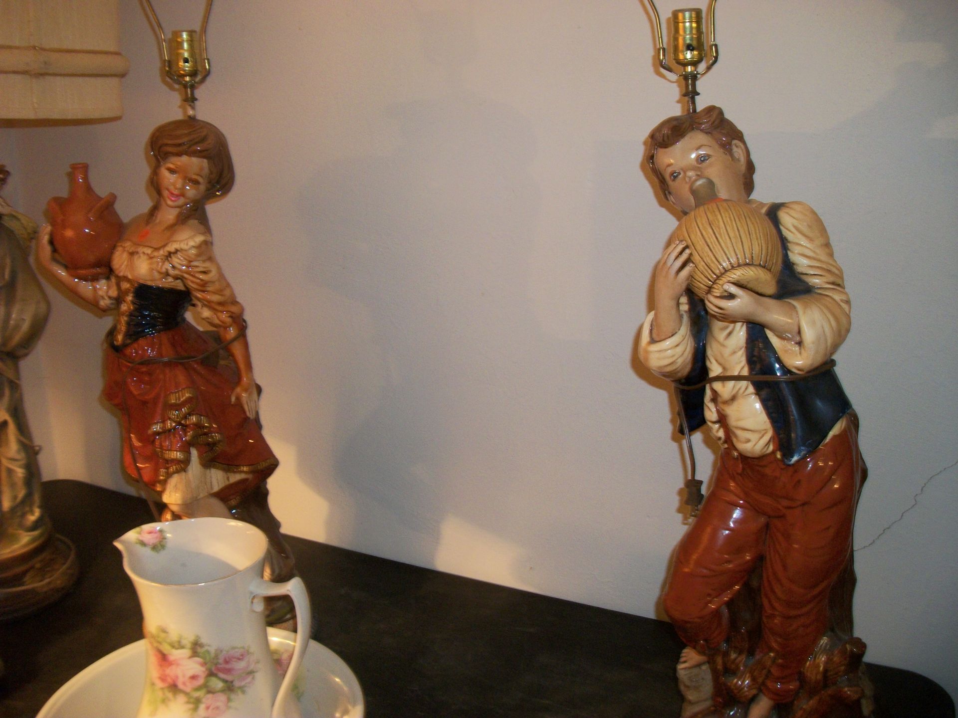 ANTIQUES AND MORE: 2 beautiful crystal lamps, figurine lamps, pitcher/bowl set, floor lamps, hand made floor rugs, Indian blankets, Indian pottery, pyrex, fire king, heavy pressed glass, crystal glass, Hummel pieces, pink depression, Peanuts lunch box/thermos, sterling lamp sets, R S Prussia dishes, Johnson bros set of dishes, biscuit jar, porcelain, statures, bust, cupid brass clock, mantel clocks, wall clocks, coo-coo clocks, green marble mantel clock, 2 candle abras, antique wall mount telephones, radial turn dial telephones, medical design brass statues, hand carved mirrors, shadow box mirrors, gum ball machine, American Flyer Frontiers-men train set in original box, 2 other train sets, American MFC Co. Character Reading scale, brass pieces, arrow heads, medical beakers, ostrich eggs, antique toys, opera glasses, binoculars, tapestry's, record player, camera/tripods, metal Dr pepper sign, Therma chest cooler, antique press, jewelry, treadle sewing machine base, feather weight singer sewing machines, kids singer sewing machine, marbles, religious items, medical instruments, lounger, child rocker, trunks, water round, water trough, air compressor, clay pots, milk parlor chairs, Bronze Coyote by Roger Aston