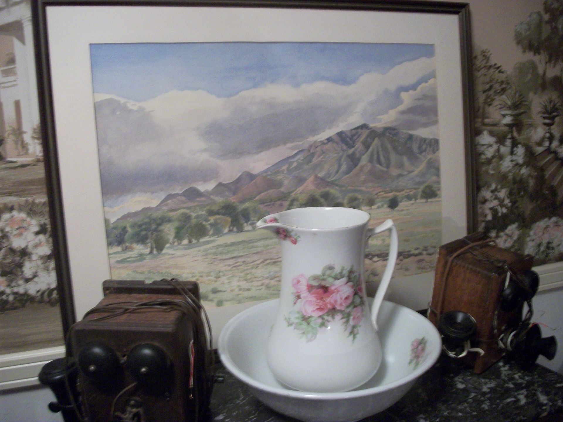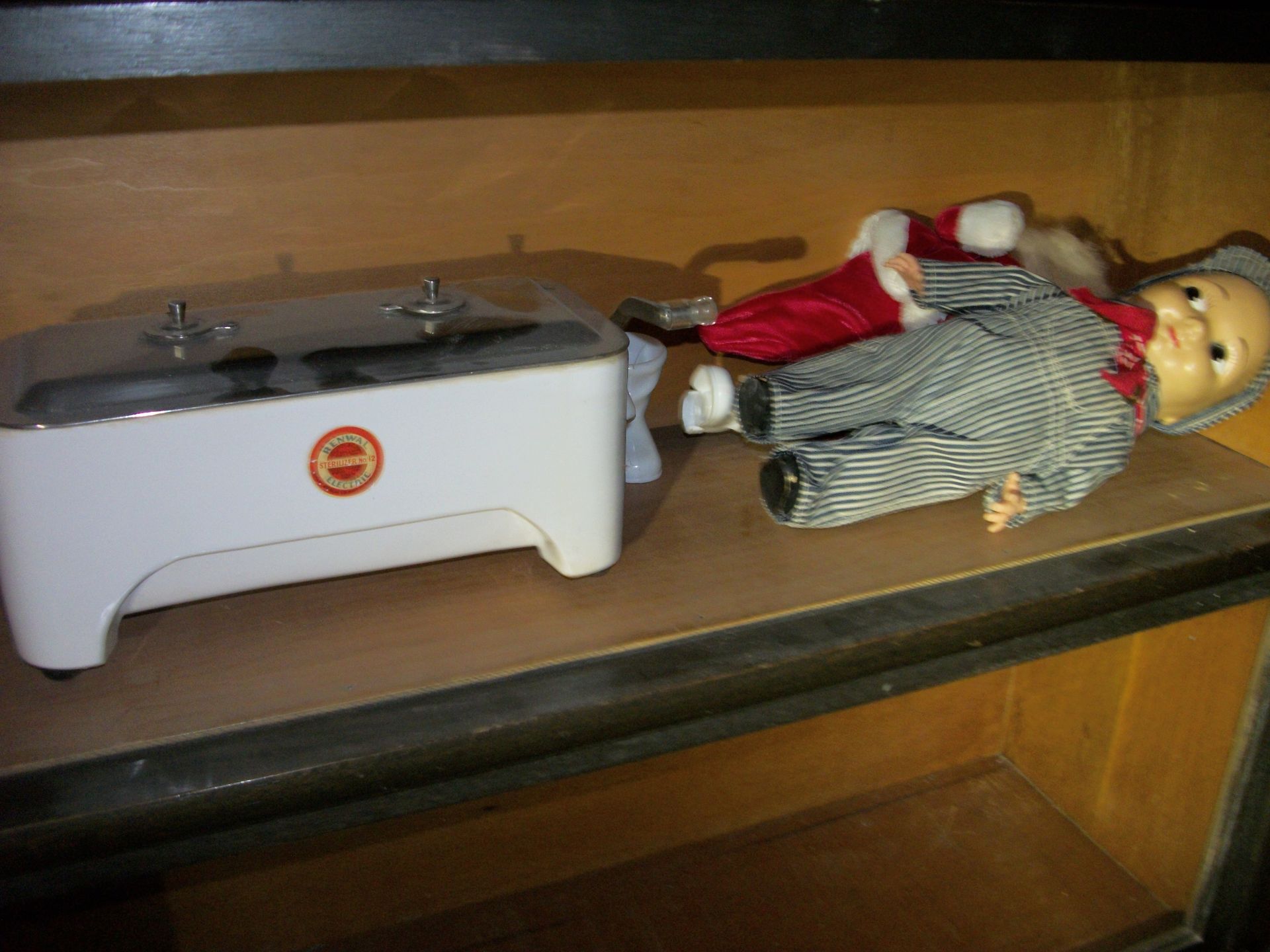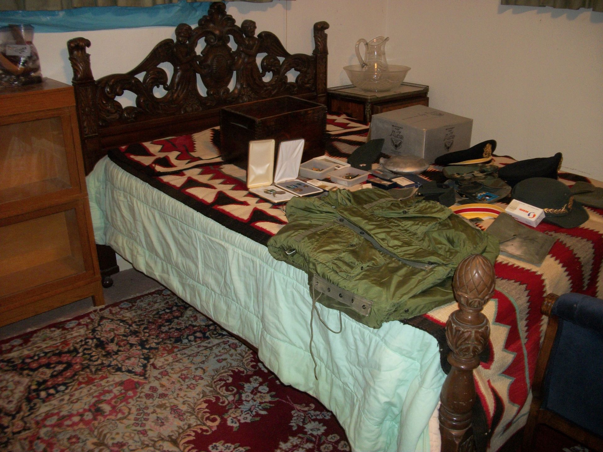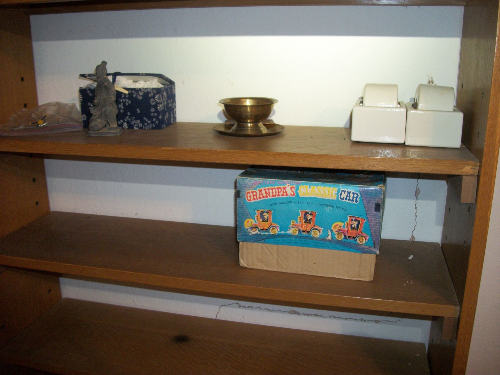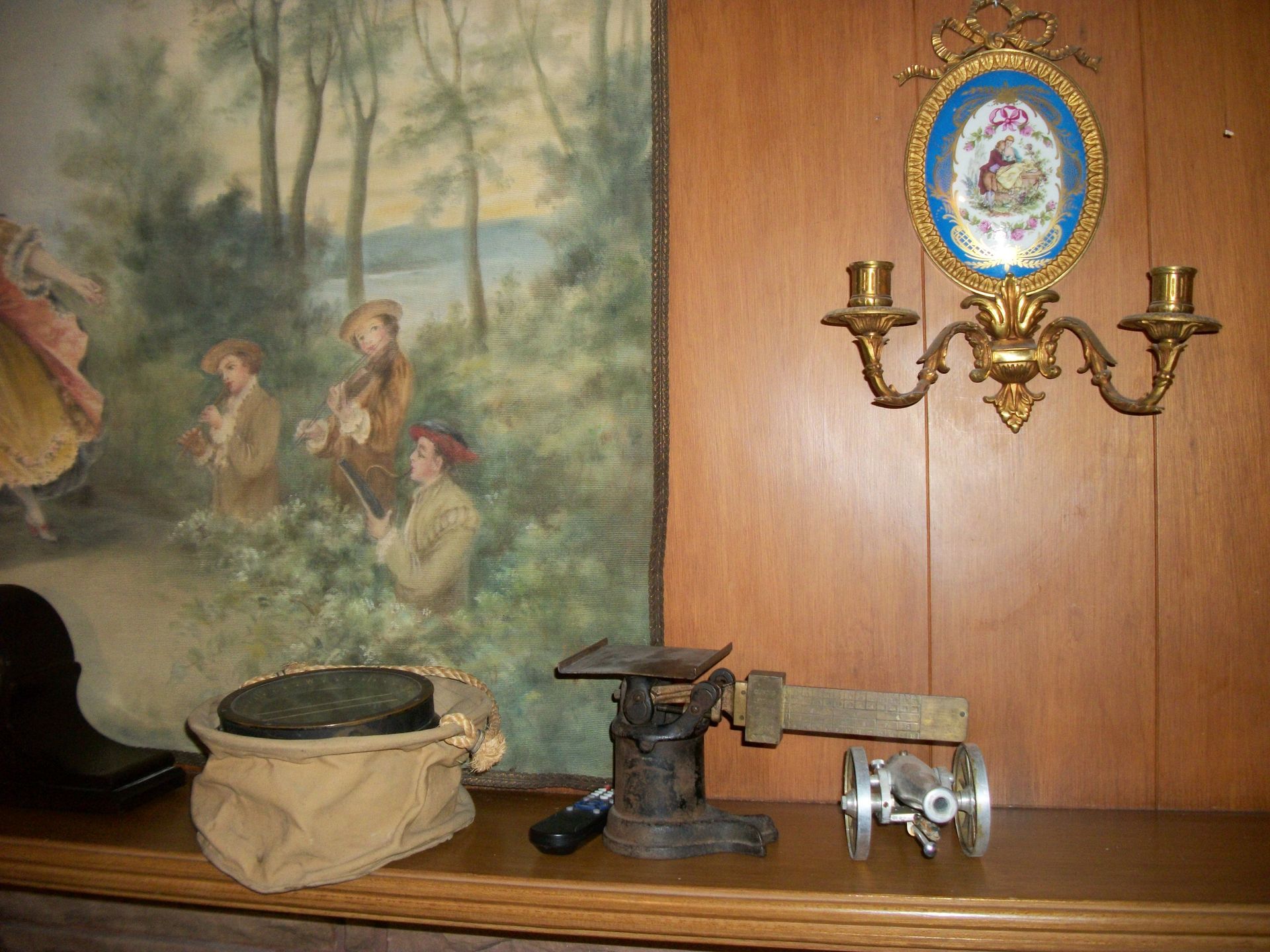 ANTIQUES AND MORE: 2 beautiful crystal lamps, figurine lamps, pitcher/bowl set, floor lamps, hand made floor rugs, Indian blankets, Indian pottery, pyrex, fire king, heavy pressed glass, crystal glass, Hummel pieces, pink depression, Peanuts lunch box/thermos, sterling lamp sets, R S Prussia dishes, Johnson bros set of dishes, biscuit jar, porcelain, statures, bust, cupid brass clock, mantel clocks, wall clocks, coo-coo clocks, green marble mantel clock, 2 candle abras, antique wall mount telephones, radial turn dial telephones, medical design brass statues, hand carved mirrors, shadow box mirrors, gum ball machine, American Flyer Frontiers-men train set in original box, 2 other train sets, American MFC Co. Character Reading scale, brass pieces, arrow heads, medical beakers, ostrich eggs, antique toys, opera glasses, binoculars, tapestry's, record player, camera/tripods, metal Dr pepper sign, Therma chest cooler, antique press, jewelry, treadle sewing machine base, feather weight singer sewing machines, kids singer sewing machine, marbles, religious items, medical instruments, lounger, child rocker, trunks, water round, water trough, air compressor, clay pots, milk parlor chairs, Bronze Coyote by Roger Aston