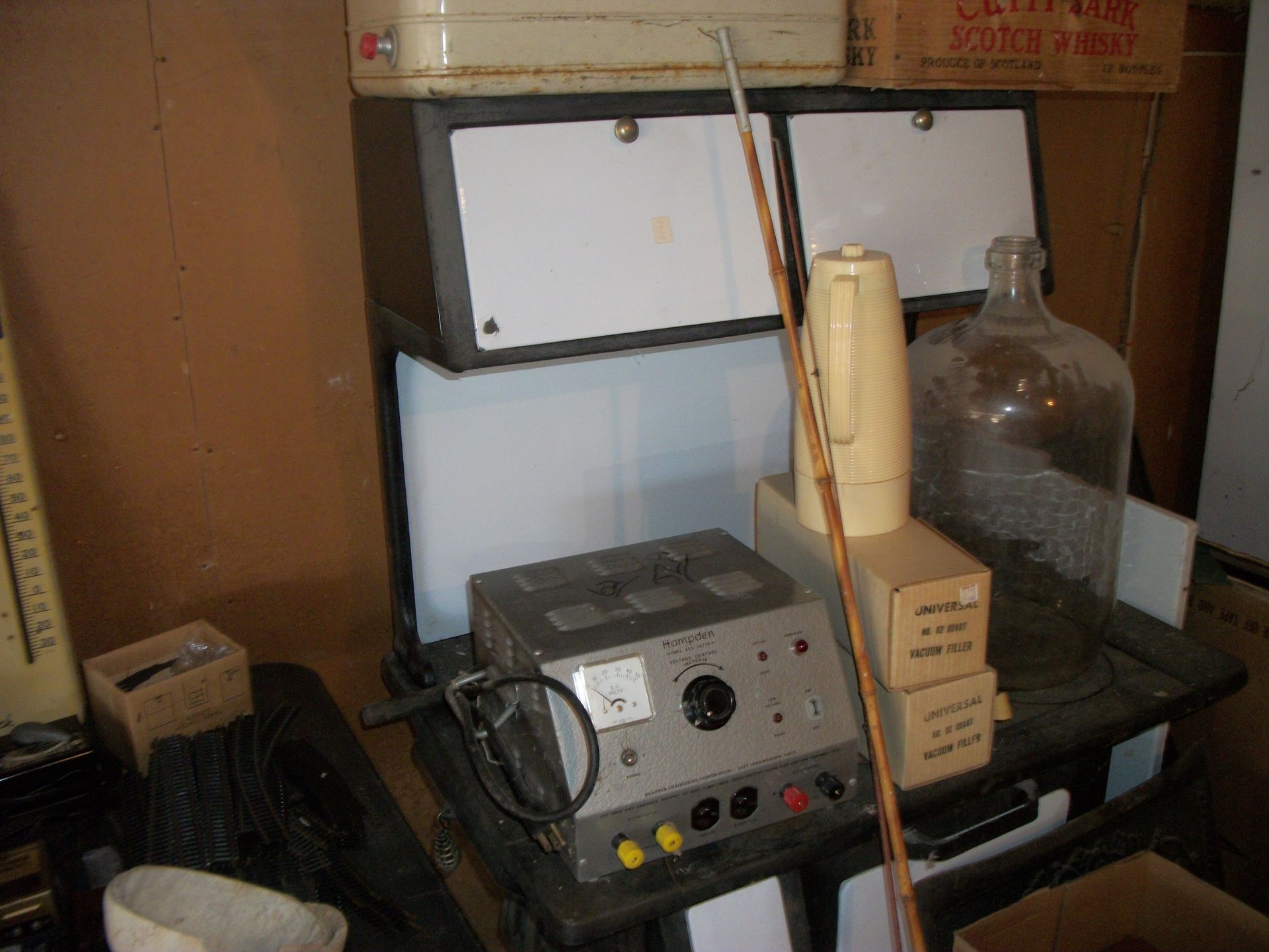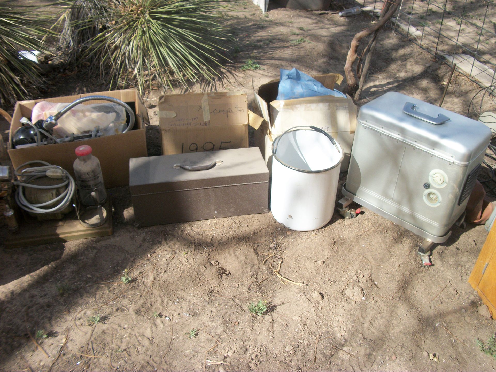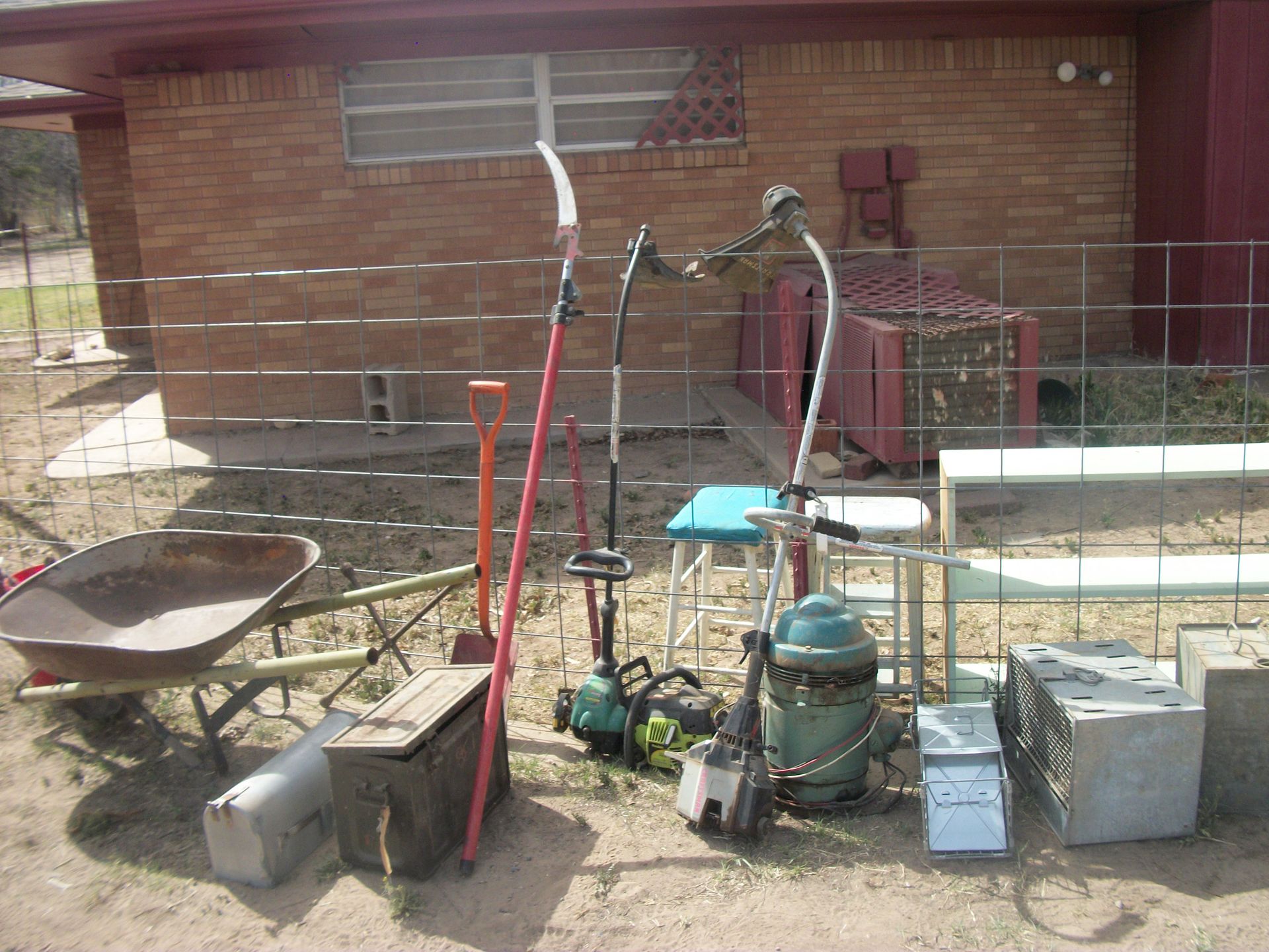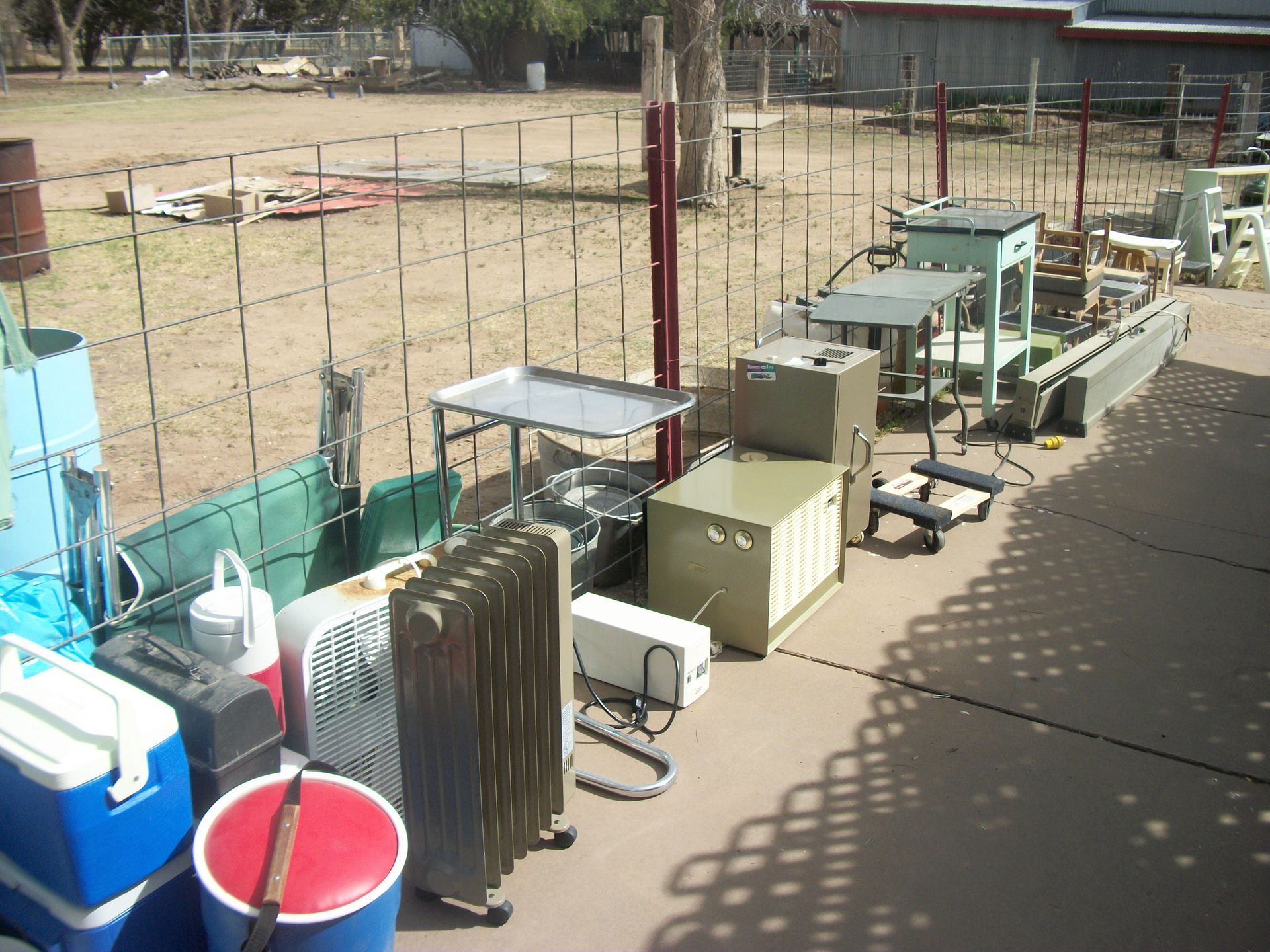 APPLIANCES AND SUCH: Kenmore d/d refrigerator, apartment size refrigerator, small appliances, Nordic ski set, fire extinguishers, baby scales, weed eaters, rocks, chicken feeders, canes, metal medical carts, vizio tv, book shelves, skulls, small sentry sate, tool box, step stools, galvanized tubs, animal traps, prayers, pump motor, pedestal tables, lots of box of contents, plus much more that could be found.