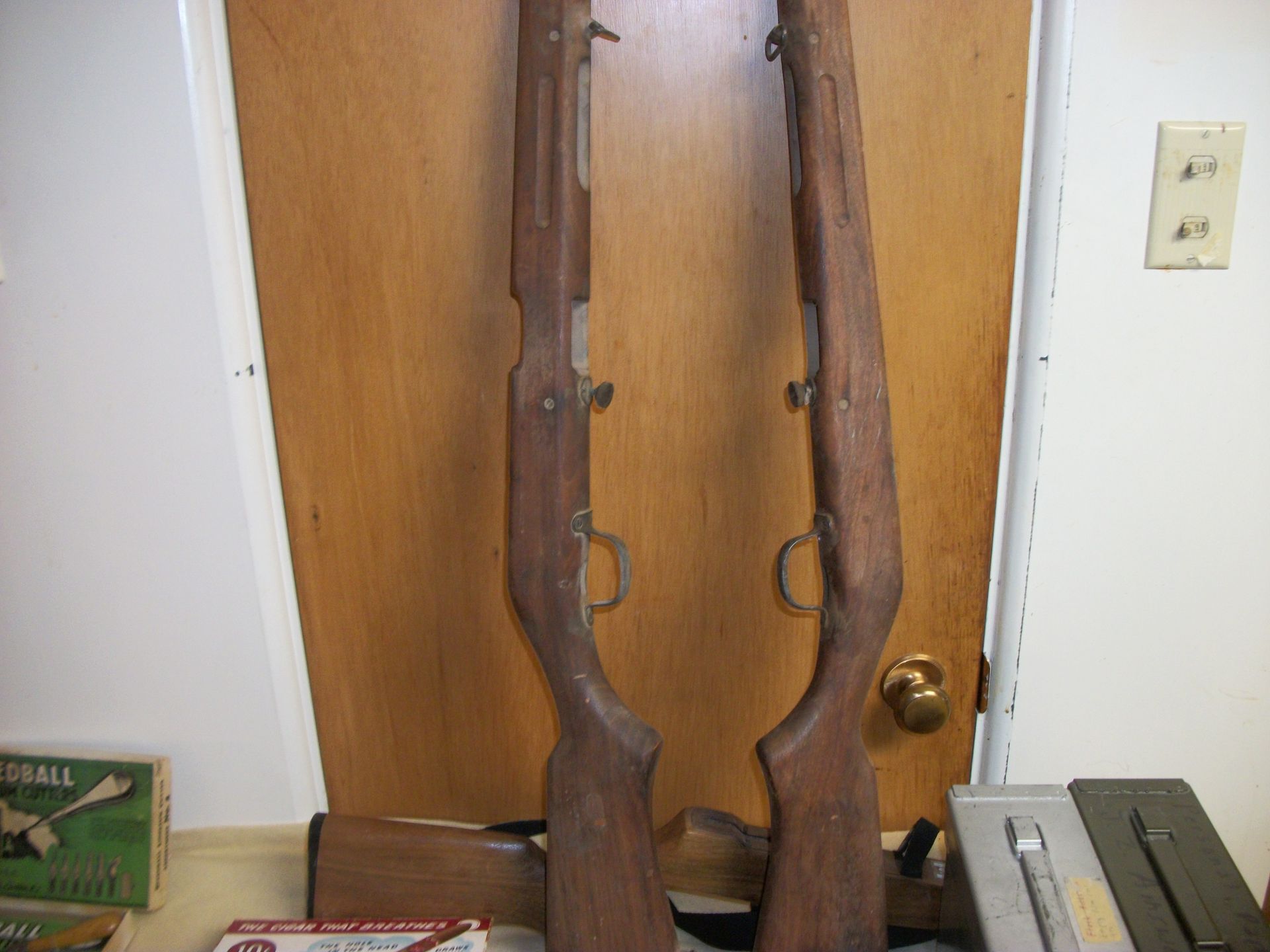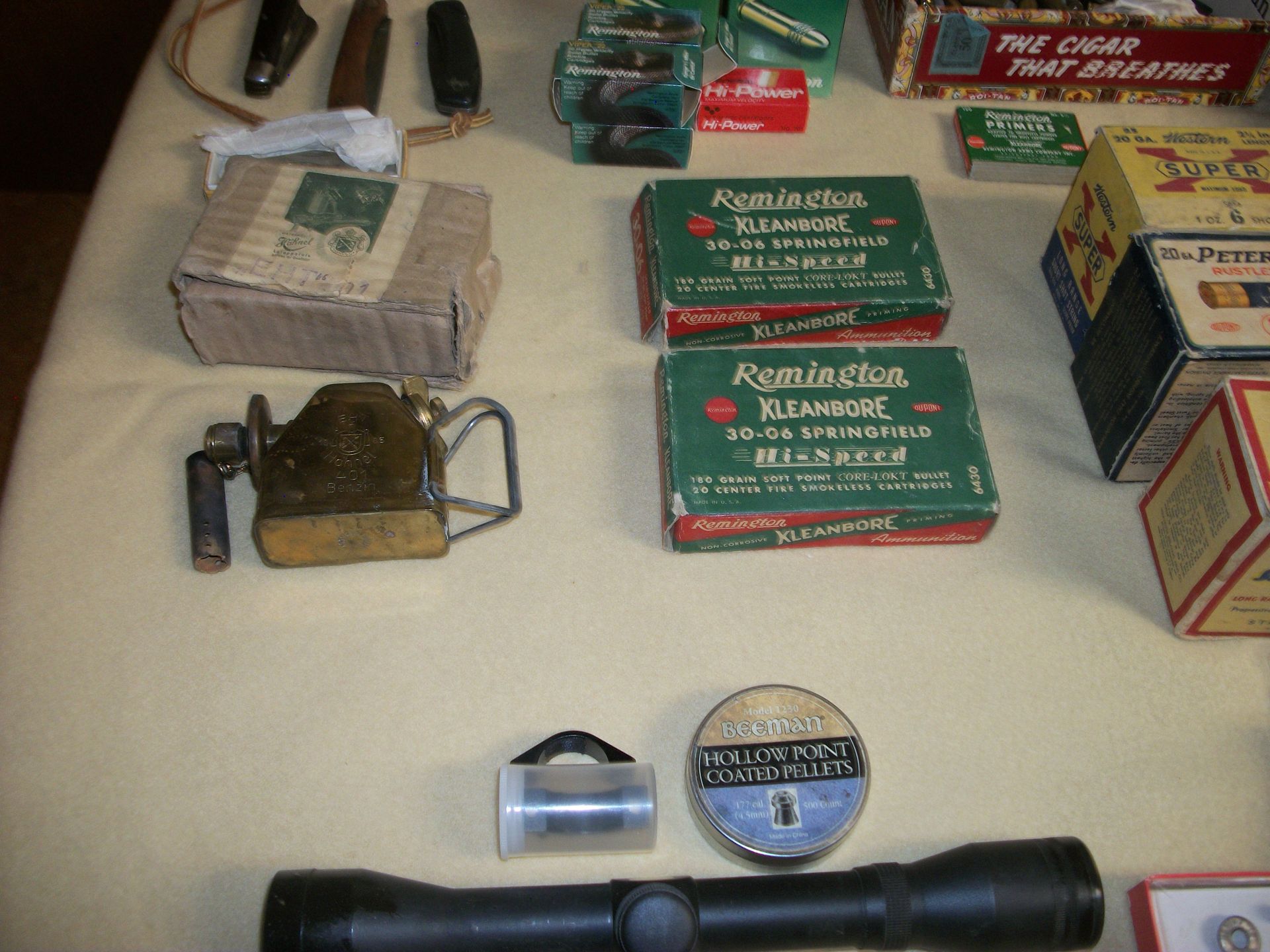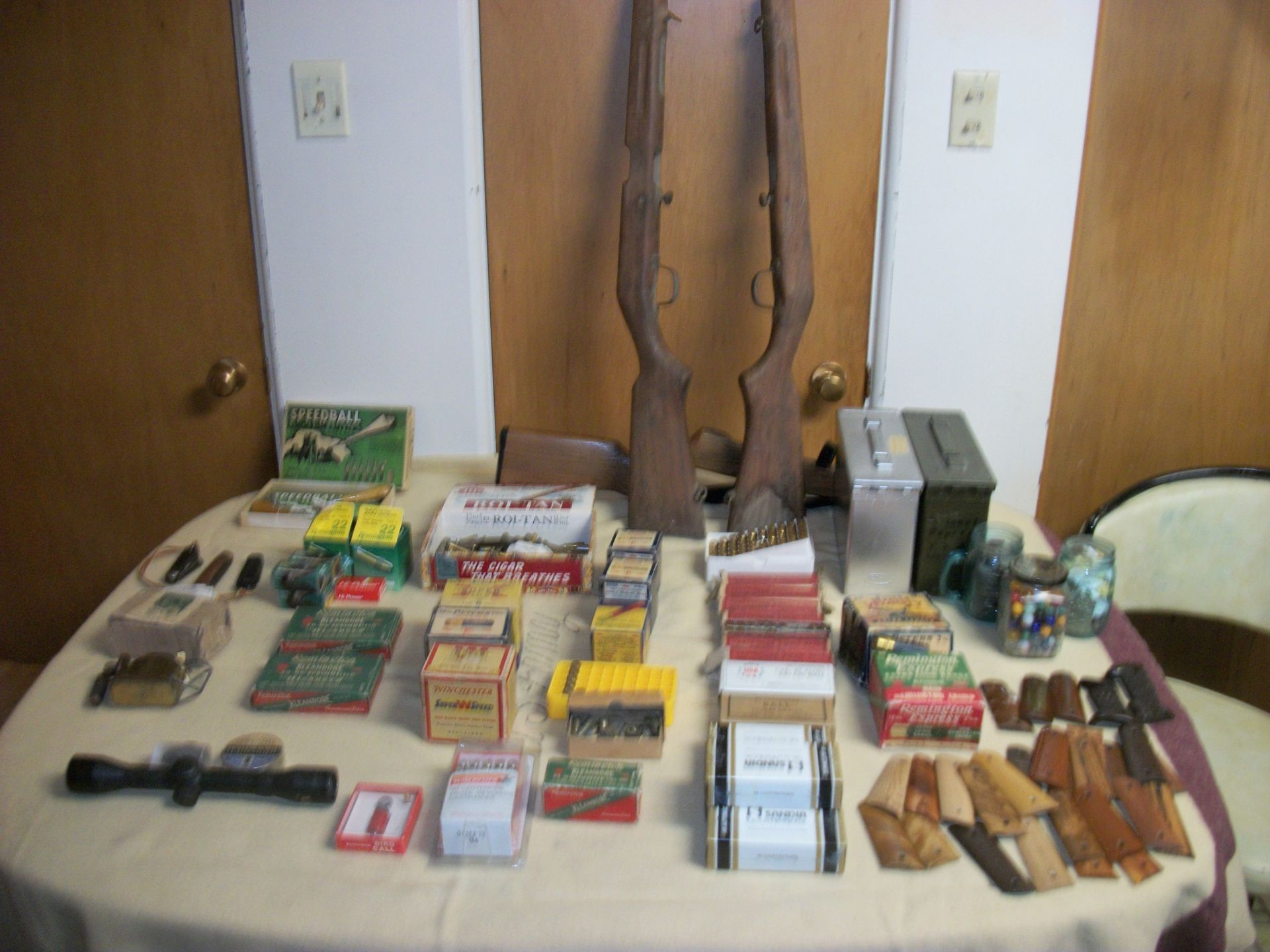 AMMO AND GUNS: Gunstocks m-1 grand, ammo 30-06, 410 Peters, zoga, 45 auto, 38 special, 22, full size 45 pistol/grips custom made by CC Chambers, Military items, lighters, knives, fishing reels