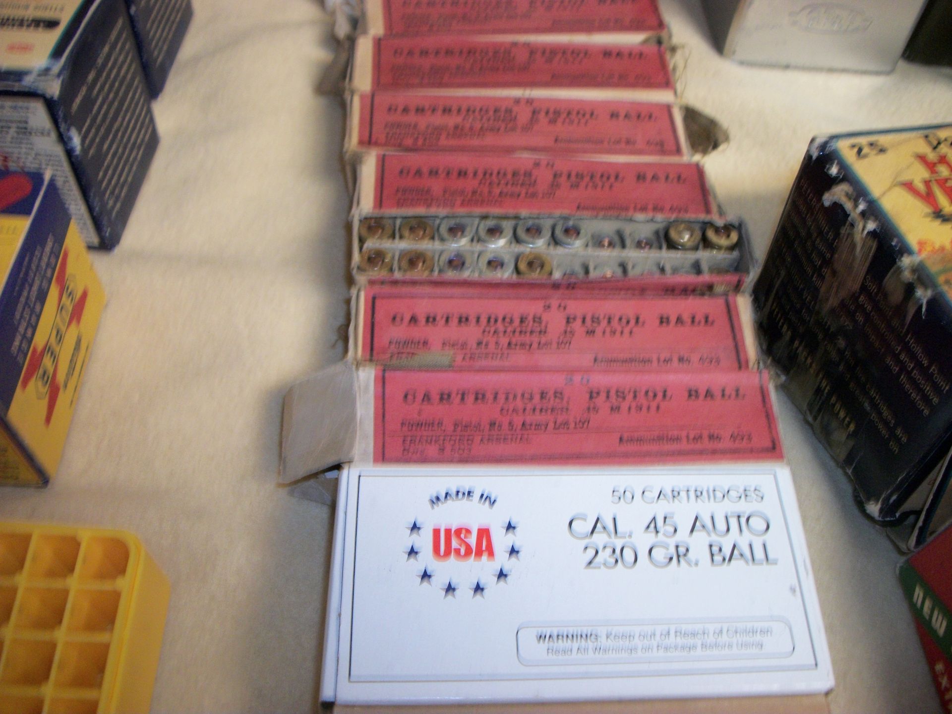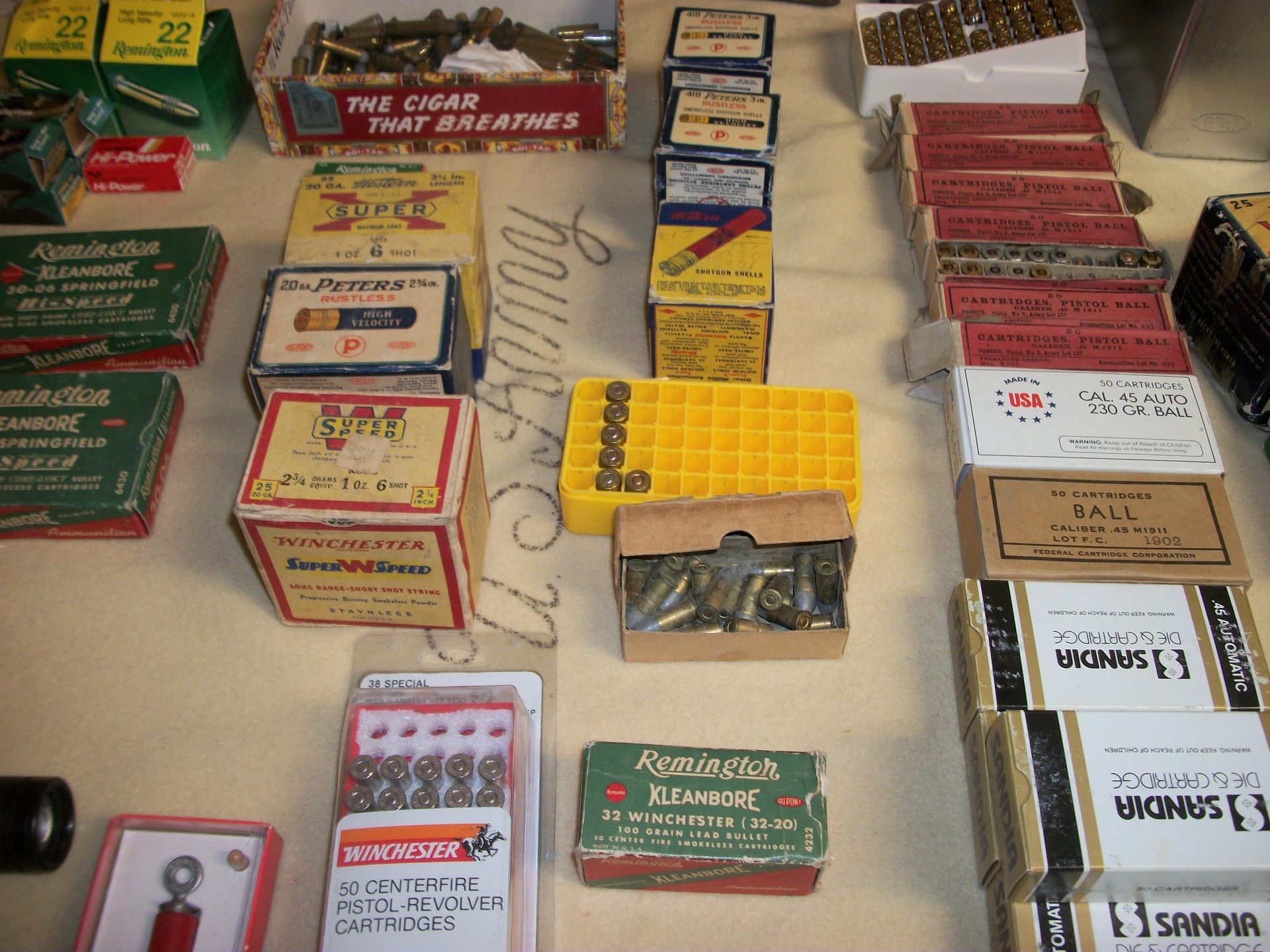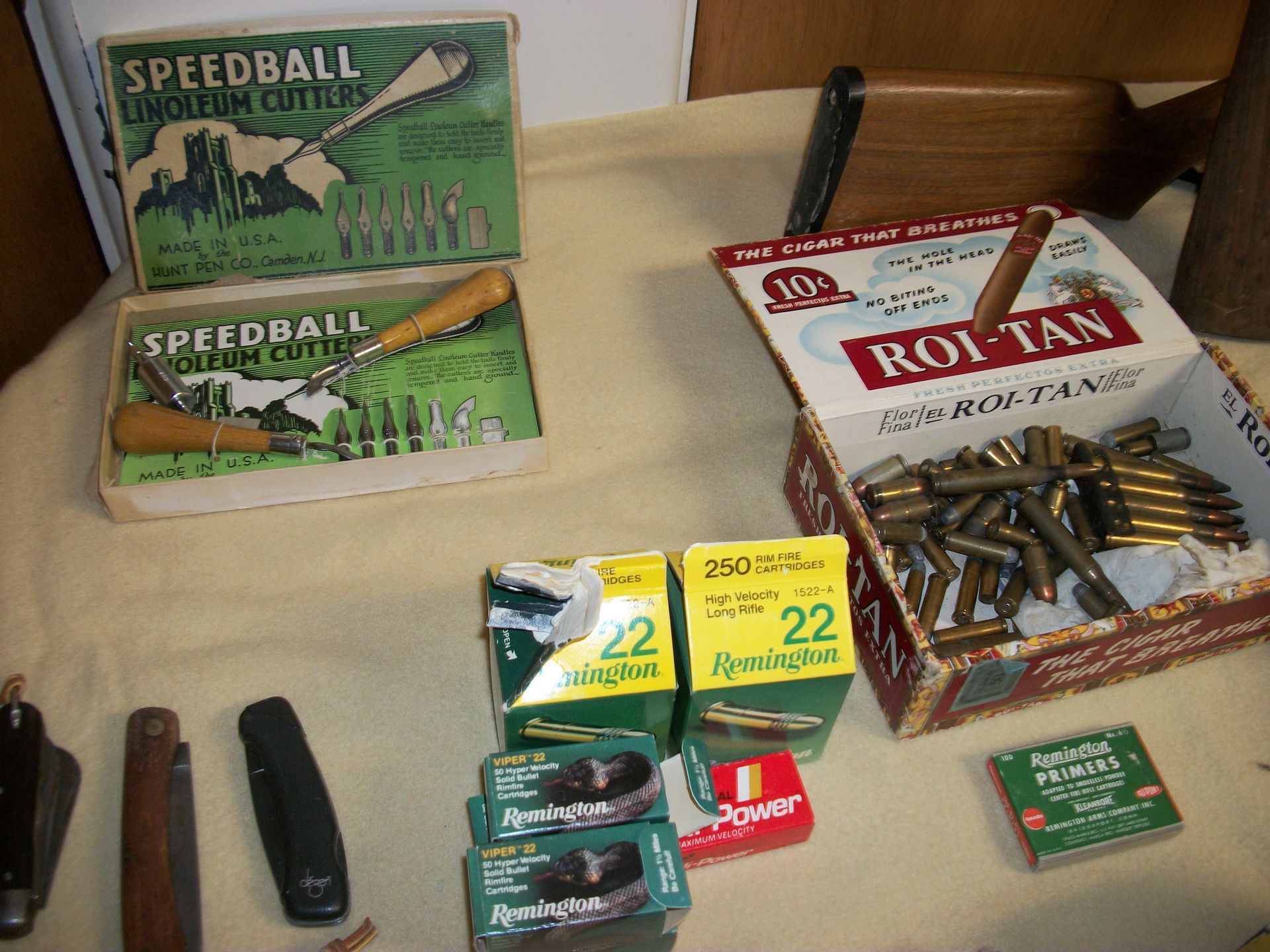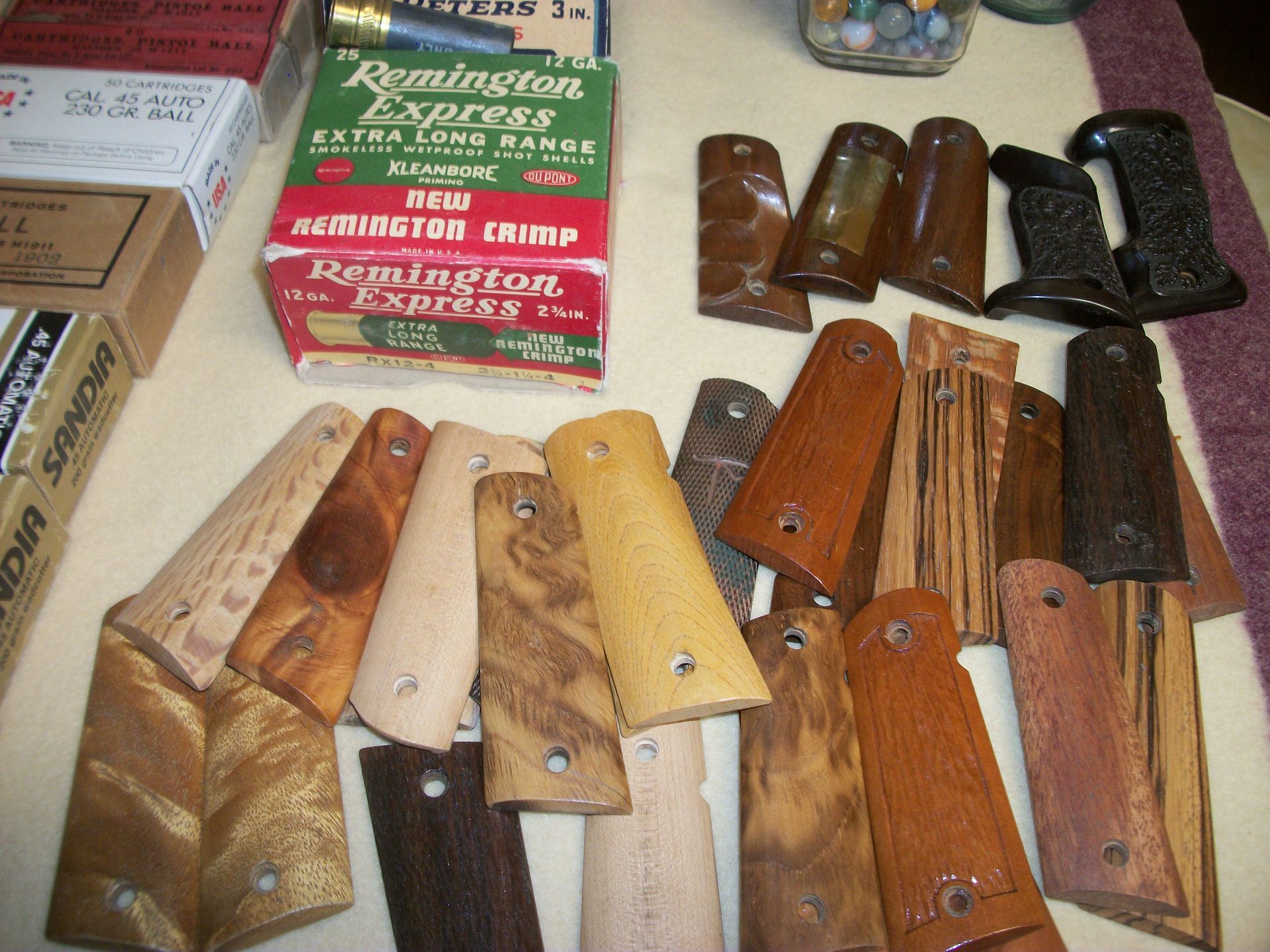 AMMO AND GUNS: Gunstocks m-1 grand, ammo 30-06, 410 Peters, zoga, 45 auto, 38 special, 22, full size 45 pistol/grips custom made by CC Chambers, Military items, lighters, knives, fishing reels